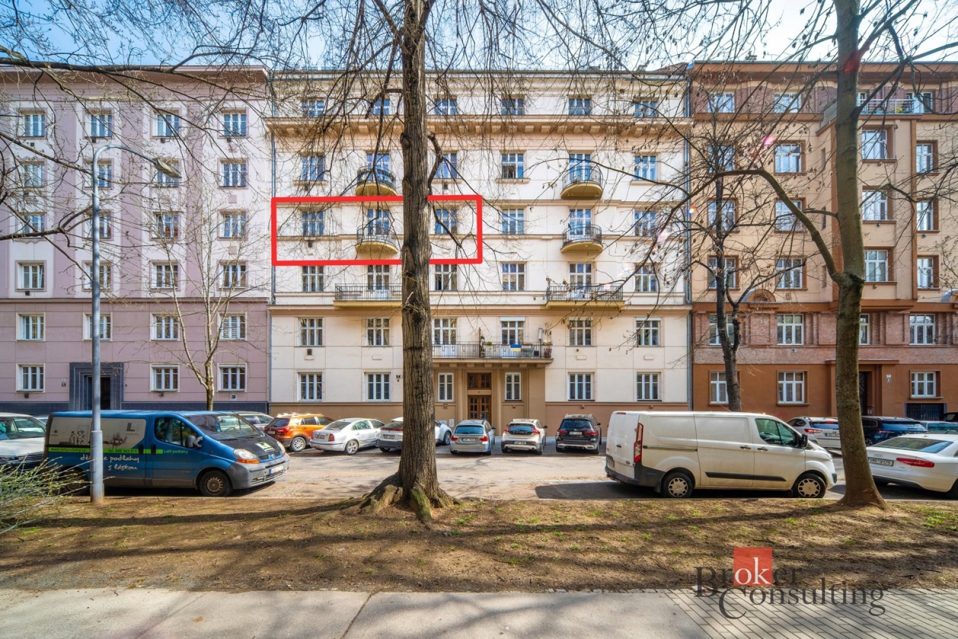Dispozice zahrnuje 3 průchozí pokoje o velikostech 25,4 m², 25,6 m² a 24,4 m². Prostřední pokoj nabízí balkón (3,3 m²) s orientací na západ do ulice. Kuchyně (11,7 m²) plynule navazuje na jídelnu (4,8 m²) a praktickou spíž (2,2 m²). Na východní stranu do klidného vnitrobloku směřuje lodžie (2,9 m²), koupelna (11,2 m²) a samostatné WC (1,5 m²). Srdcem bytu je impozantní předsíň o rozloze 17,9 m² s komorou (3,2 m²) a prostornou vestavěnou skříní, která propojuje pokoje s kuchyní. Součástí je i sklepní kóje o výměře 8,1 m².