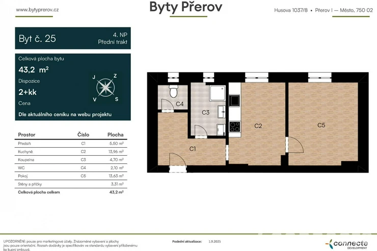 As part of the Byty Přerov development project, we are exclusively offering for sale into private ownership a modern 2-room flat with kitchenette, with a floor area of 43.2 m2, situated on the 4th floor.