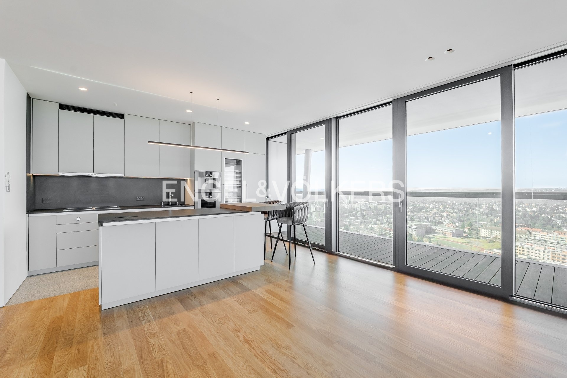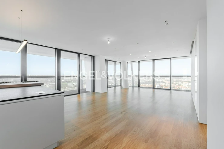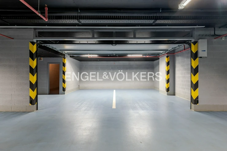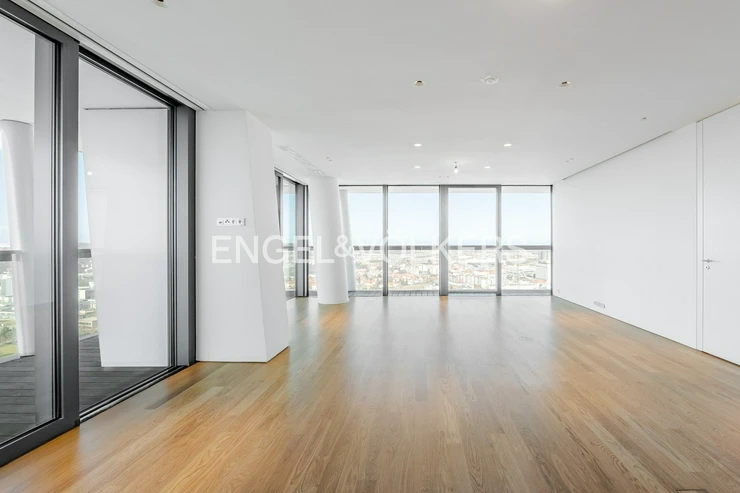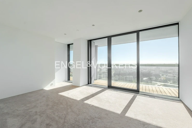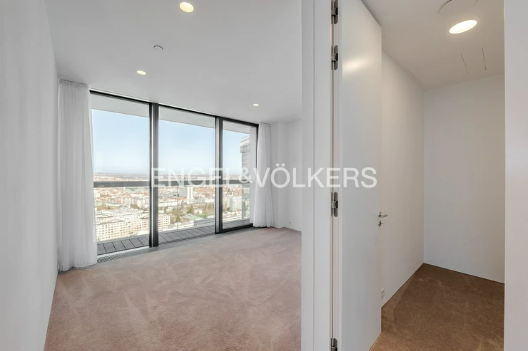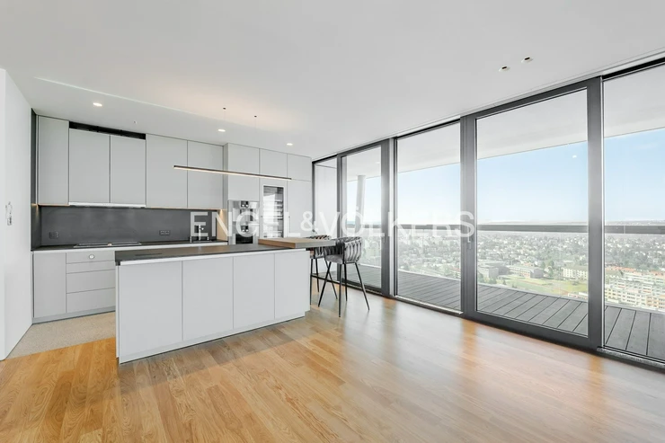 The V Tower residence is synonymous with modern urban living at the highest level. Residents have access to a 24/7 reception and an exclusive club floor with a private fitness center, swimming pool, whirlpool, sauna, conference rooms, and a children's corner. There is also a private cinema and a golf simulator. The apartment includes two lockable parking spaces in the underground garage and a brick cellar cubicle.