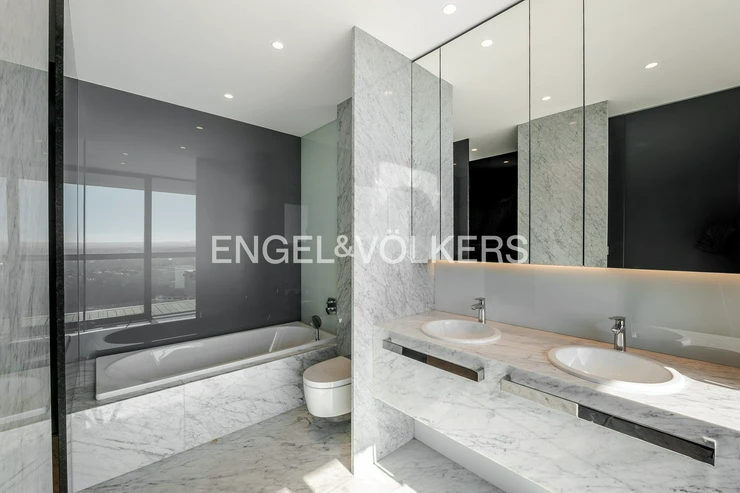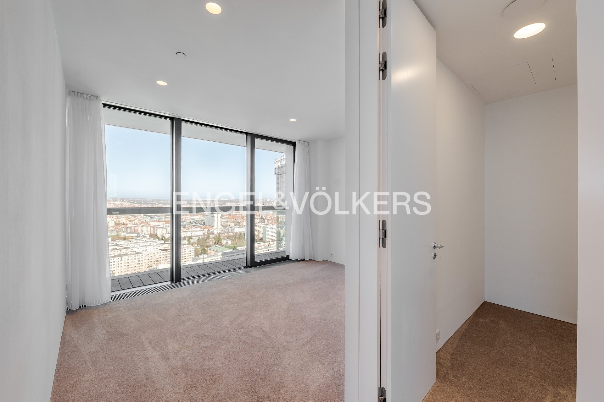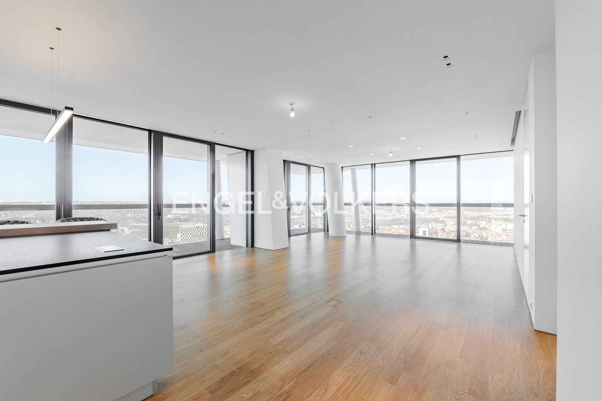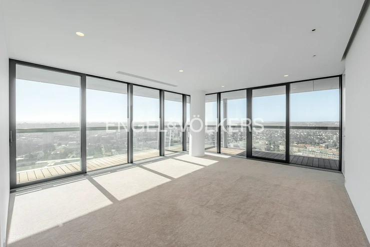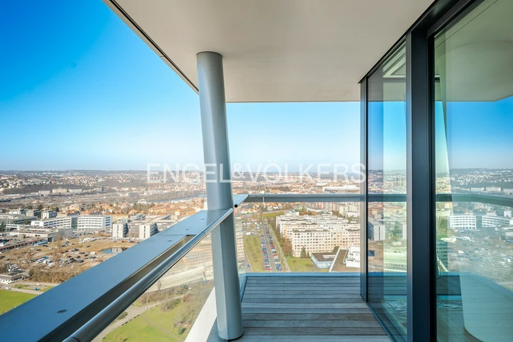 We present for sale an exceptional luxury 4+kk apartment in the prestigious V Tower residence from 2018, located on the 25th floor of the western tower. This unique apartment with an internal usable area of 194 sqm is complemented by a spacious 57 sqm terrace, from which you can enjoy breathtaking panoramic views of Prague from three cardinal directions, including views of the city center, Prague Castle, and Vyšehrad.