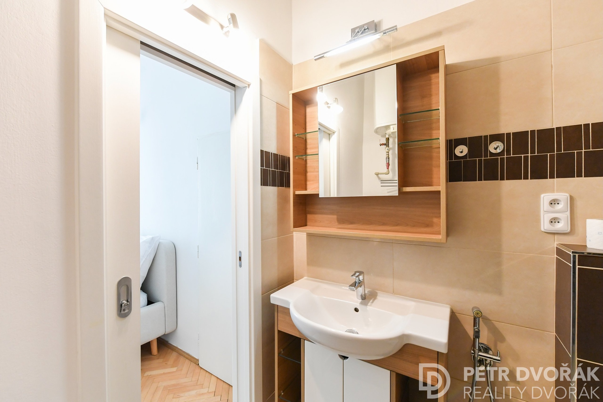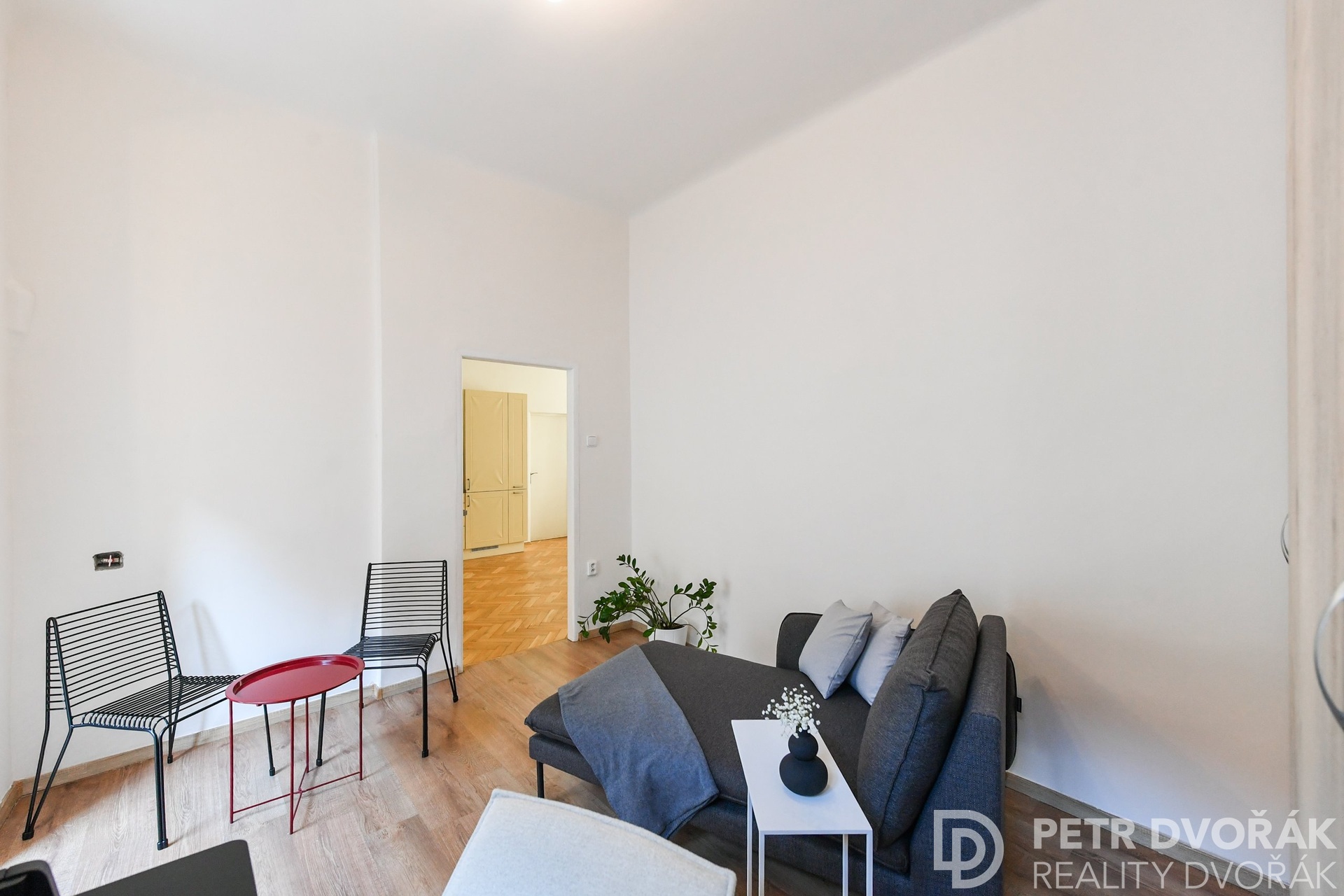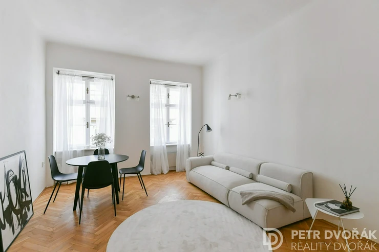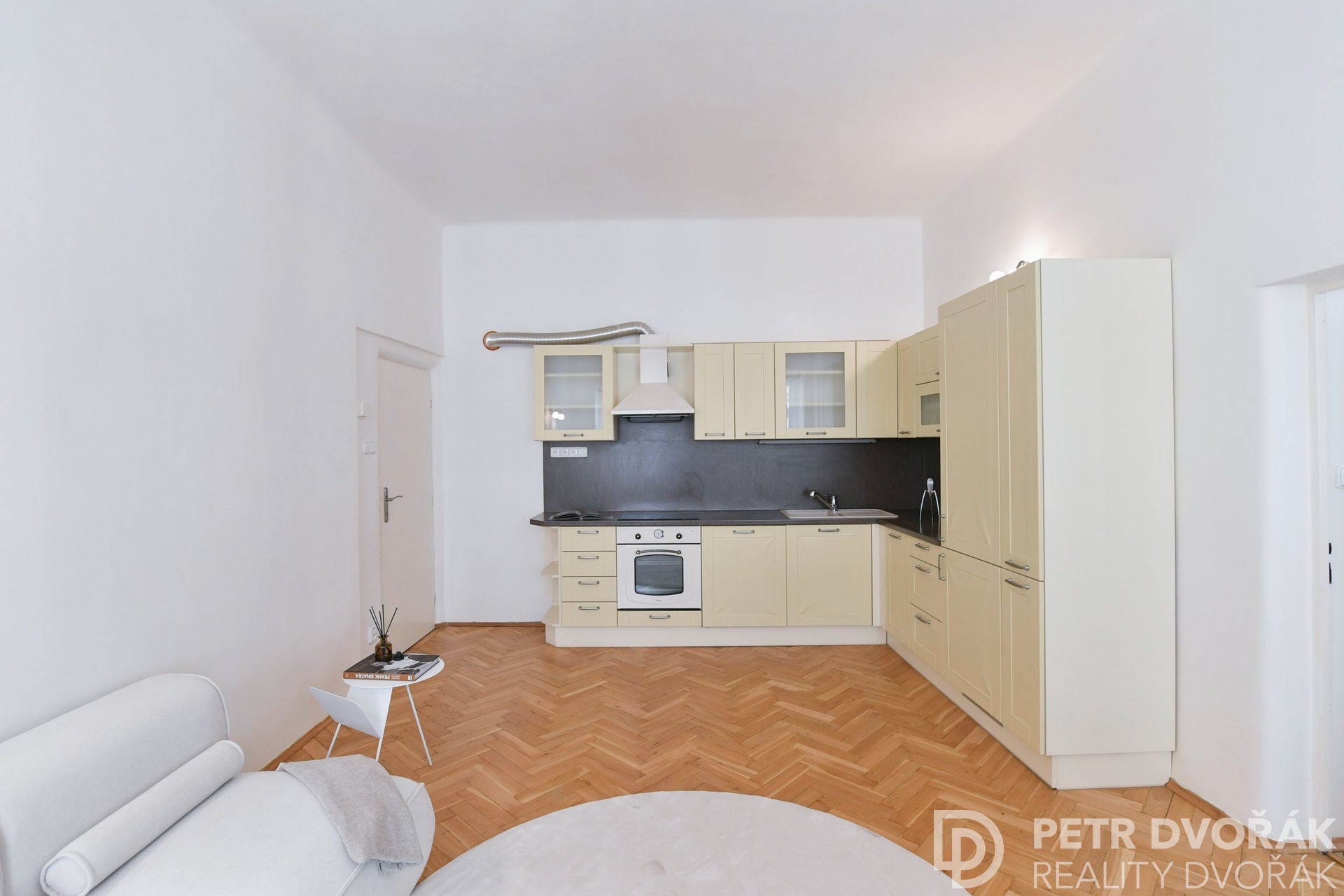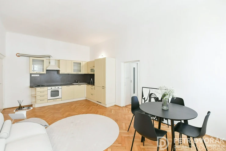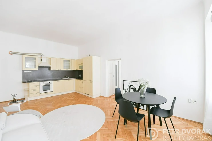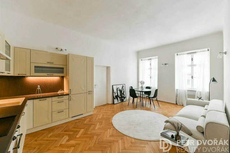 Then the living room with an open kitchen. Two box-frame windows with deep-set reveals opening onto Haštalská Street – in the morning no one rushes through here, it is one of the most authentically preserved medieval streets in Prague. The kitchen is custom-built: integrated fridge-freezer, dishwasher, electric oven, and hob. Original parquet floors, fully restored in 2024.