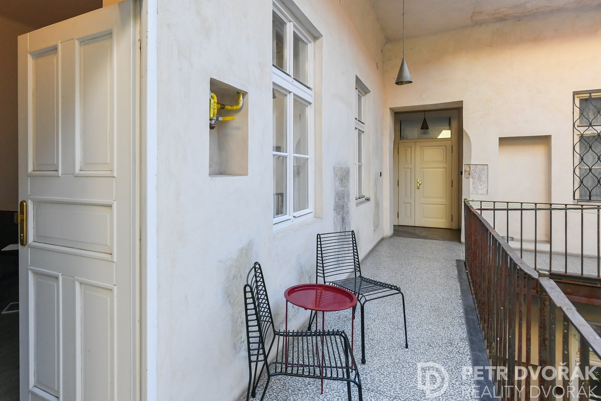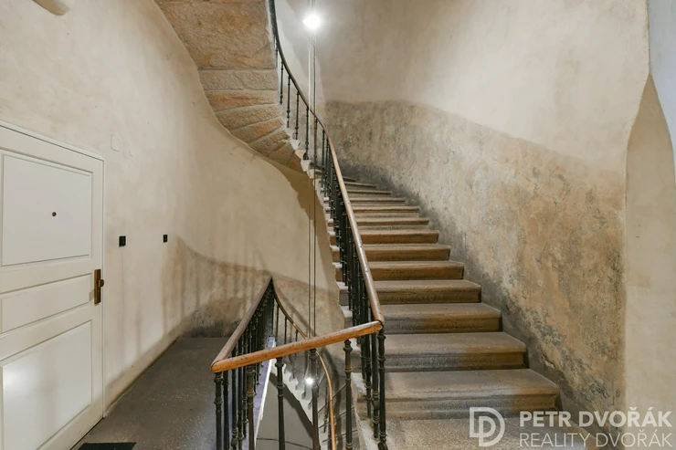 The building has stood since the 15th century. Tourists pass by, but never step inside – the stone-paved entrance hall, staircase with cast-iron balusters, and exposed stone walls are the everyday reality of those who live here. The house is part of the UNESCO-listed Prague Historic Preservation Zone and underwent a sensitive restoration – not to look historic, but because it is.