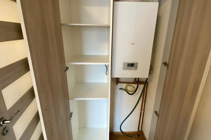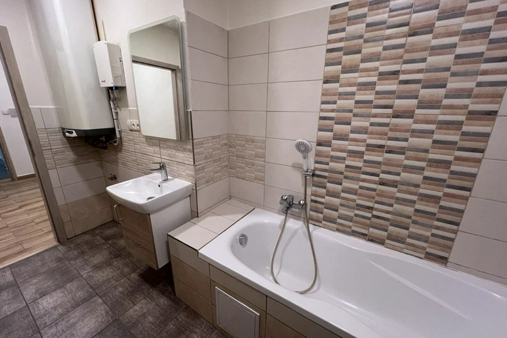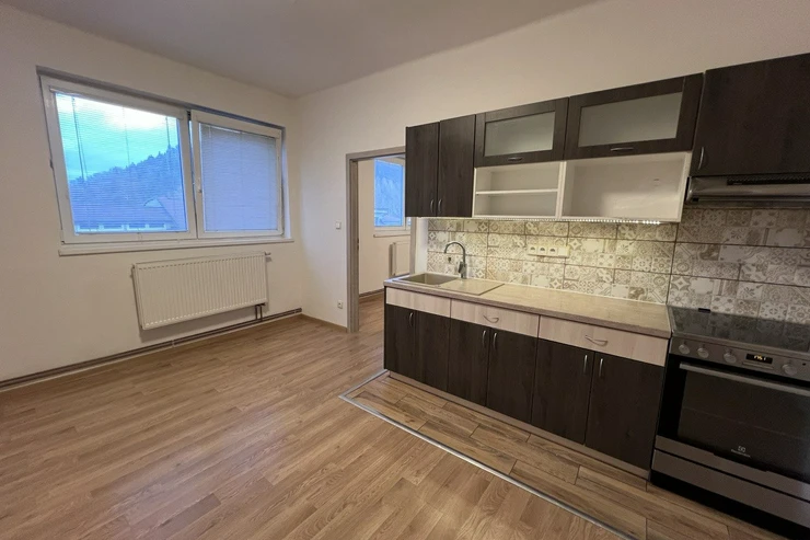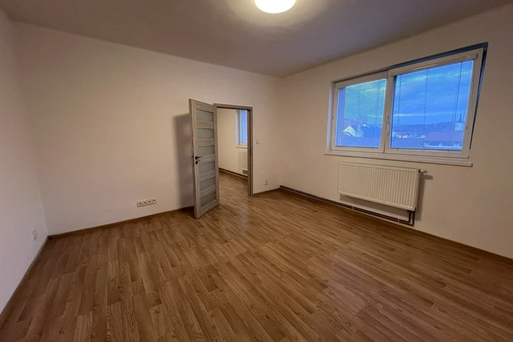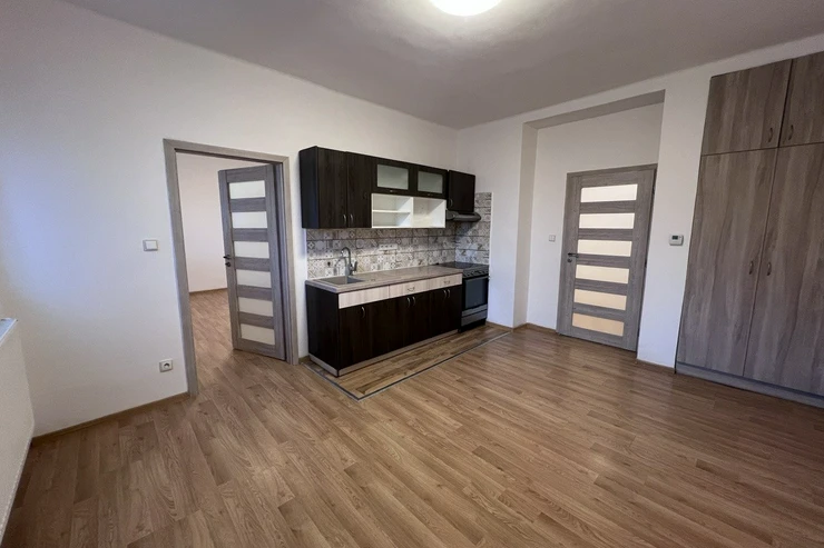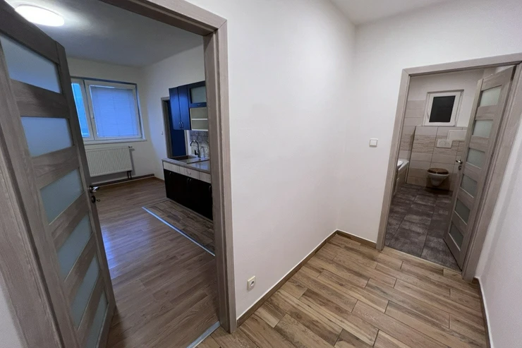 Byt nabízí praktické řešení, které zahrnuje obývací pokoj s kuchyňskou linkou, prostornou ložnici, koupelnu s vanou a WC a komoru. Všechny místnosti jsou světlé a nabízejí dostatek prostoru pro pohodlné bydlení. K bytu náleží sklepní kóje v suterénu domu – praktický úložný prostor