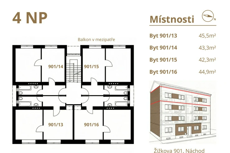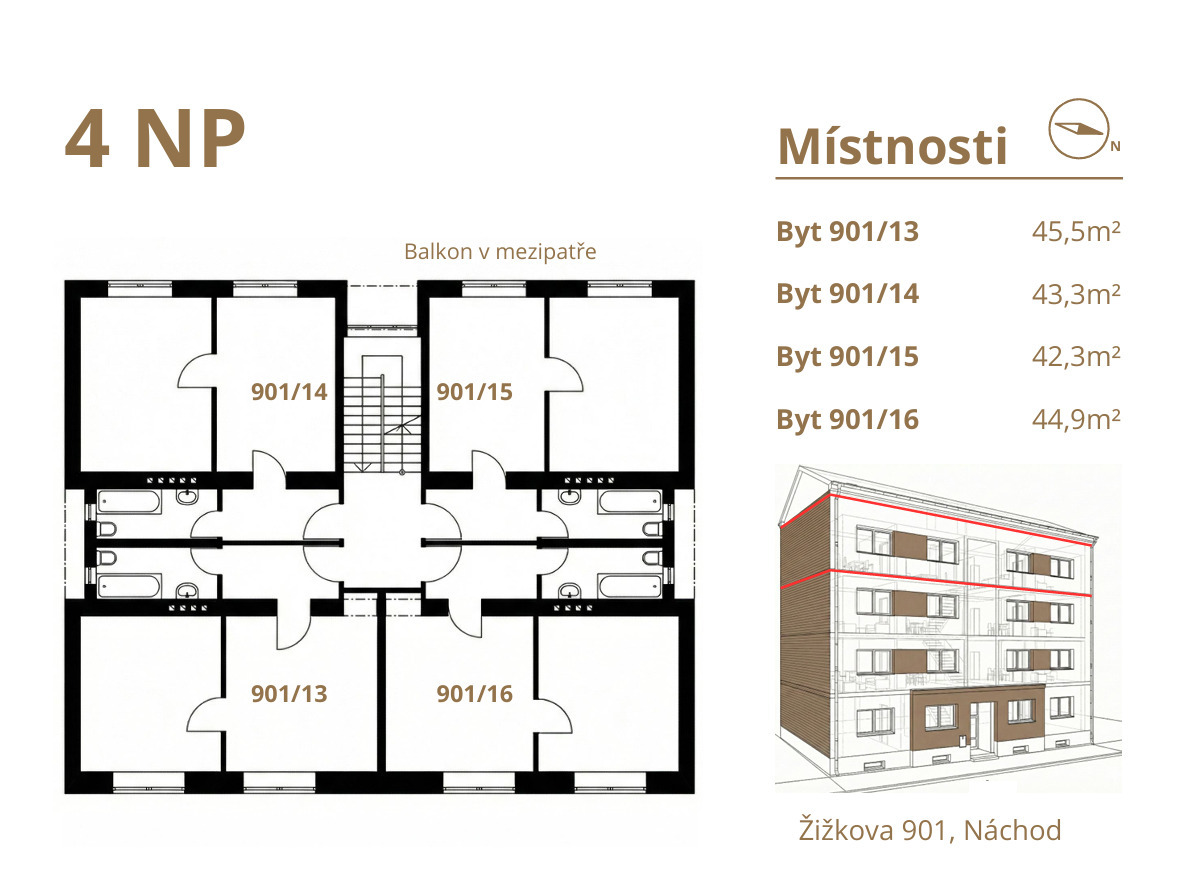 Investoři, věnujte pozornost této nabídce. Nabízíme k prodeji světlý a praktický byt o dispozici 2+kk a celkové ploše 48 m² (45 m bytová jednotka, 3 m sklep), umístěný ve 4. patře cihlového domu v klidné lokaci na Žižkova v Náchodě. Jedná se o bytovou jednotku 901/13.