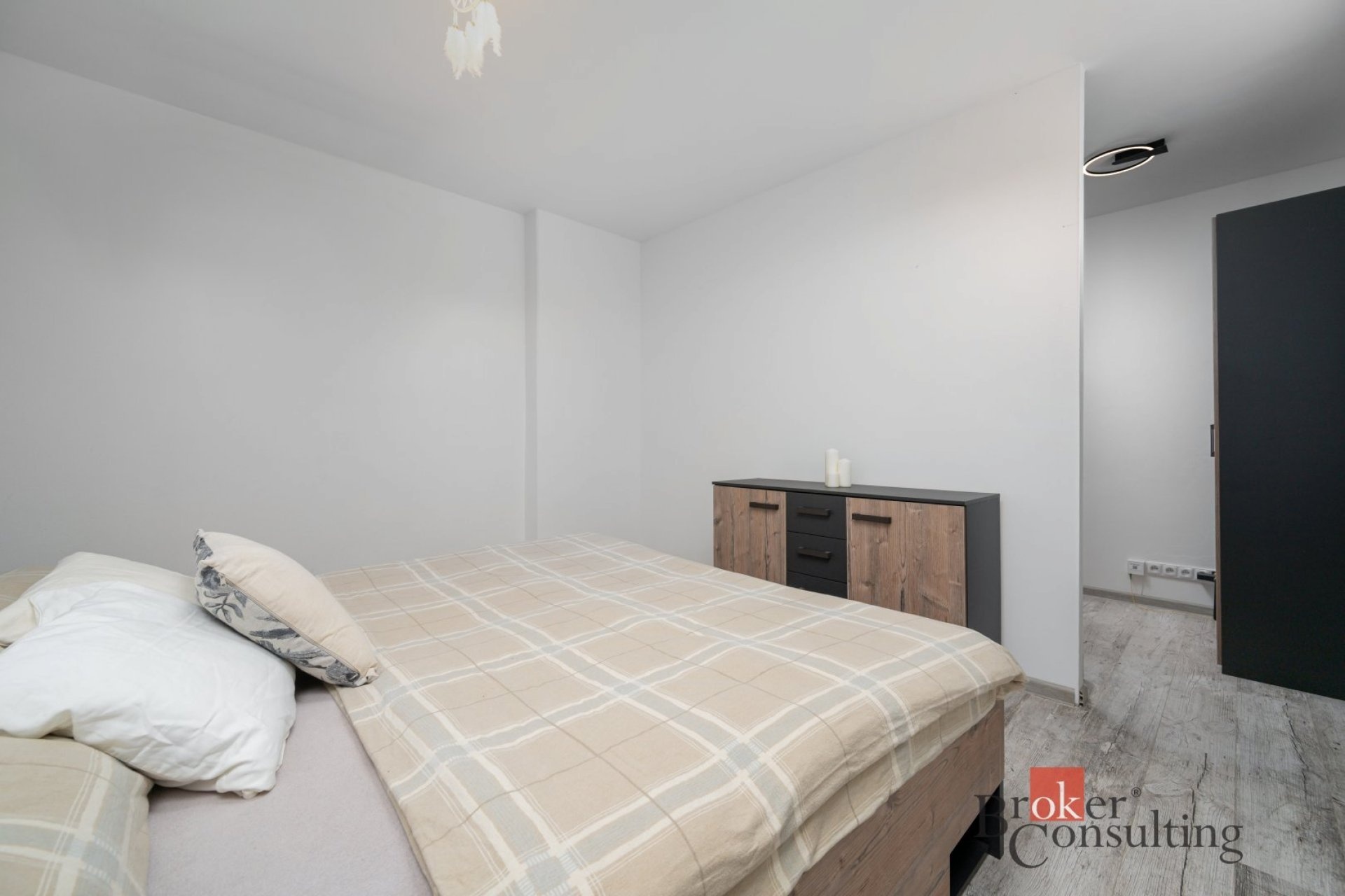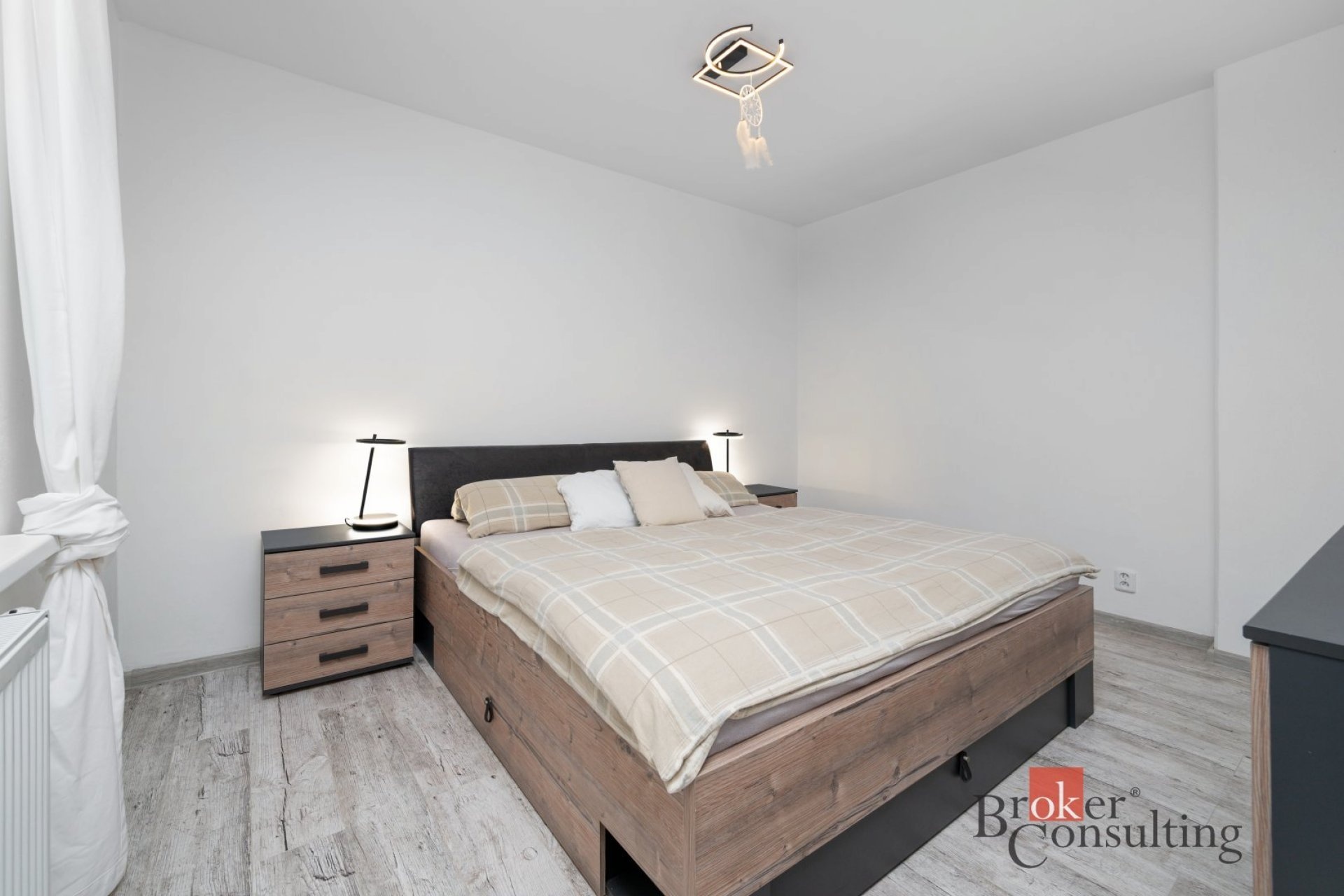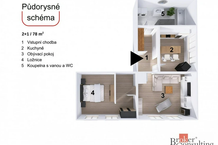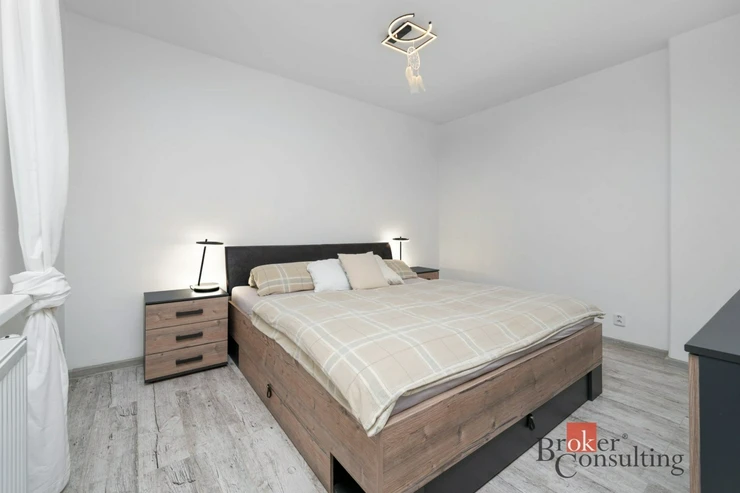 Dispozice bytu lze jednoduše upravit díky sádrokartonové příčce v ložnici oddělující pracovní kout. Posunutím by vznikl dostatečný prostor na vybudování i dětského pokoje.