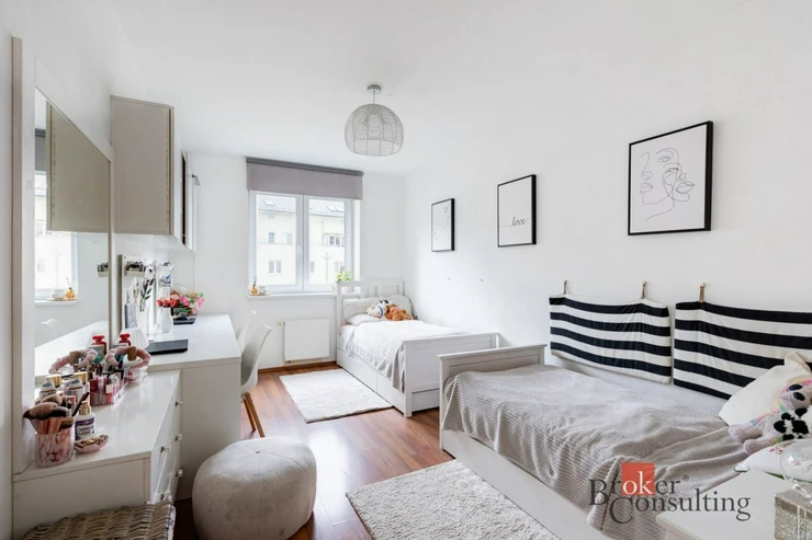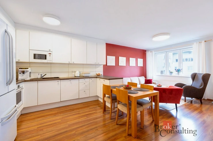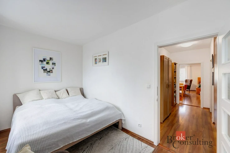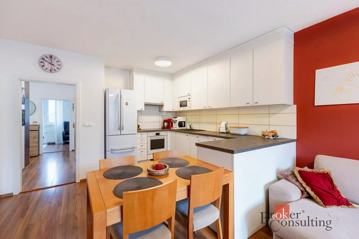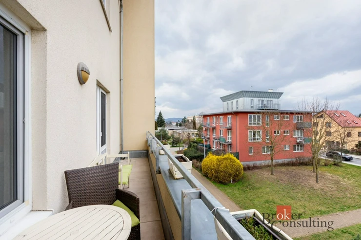 Dominantou bytu je velkoryse řešený obývací pokoj s kuchyňským koutem, který je díky velkoformátovým oknům nádherně prosvětlený a působí velmi vzdušným a elegantním dojmem. Dispozice bytu dále nabízí dvě samostatné ložnice, koupelnu s vanou, samostatnou toaletu a praktickou komoru, která poskytuje dostatek úložného prostoru. Z jedné z ložnic je přímý vstup na balkon o velikosti 6,8 m² - ideální místo pro ranní kávu, večerní sklenku vína nebo příjemné posezení s výhledem do klidného okolí.