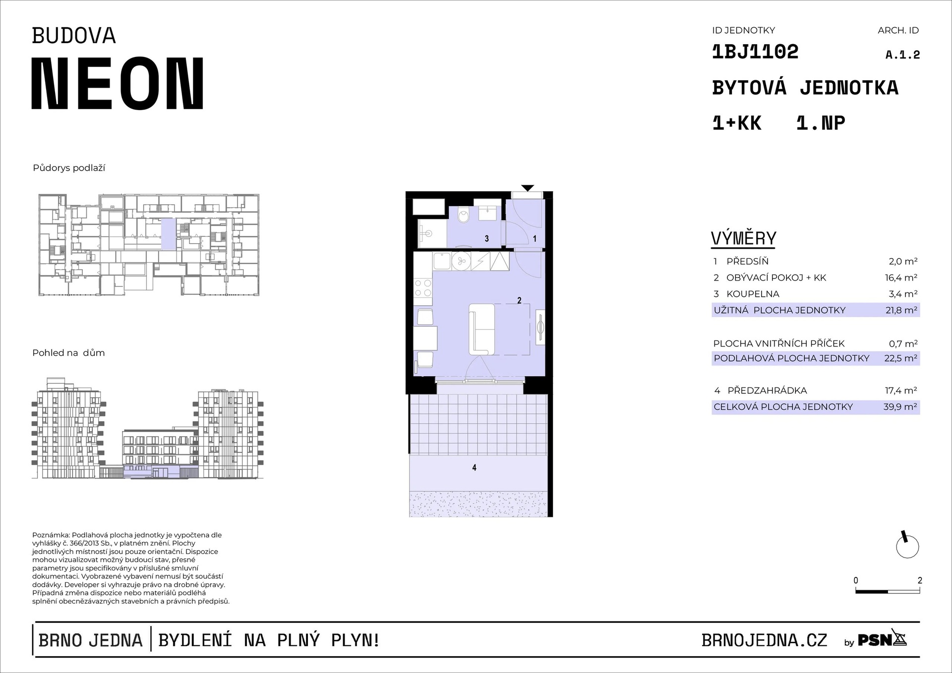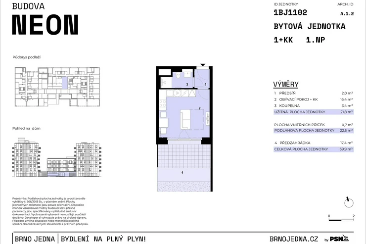 Unit No. 1102 with a studio layout and a total area of 39.90 m² will offer you a harmonious space for living, whether you are looking for your own apartment or an investment opportunity. The unit on the 1 floor includes a living area with preparation for a kitchenette, an elegant bathroom with a shower and toilet, and an entrance area with space for storage. Thanks to its orientation to the J, the apartment offers an ample amount of natural light. The unit includes a front garden, perfect for enjoying your morning cup of coffee in the fresh air or growing herbs. A cellar and a parking space must be purchased for each unit. The apartment will be ready to move into immediately with finished floors, a fitted bathroom, and a space for a kitchen unit. Standards include high quality materials, triple-glazed windows, and in selected units, preparation for outdoor shading.