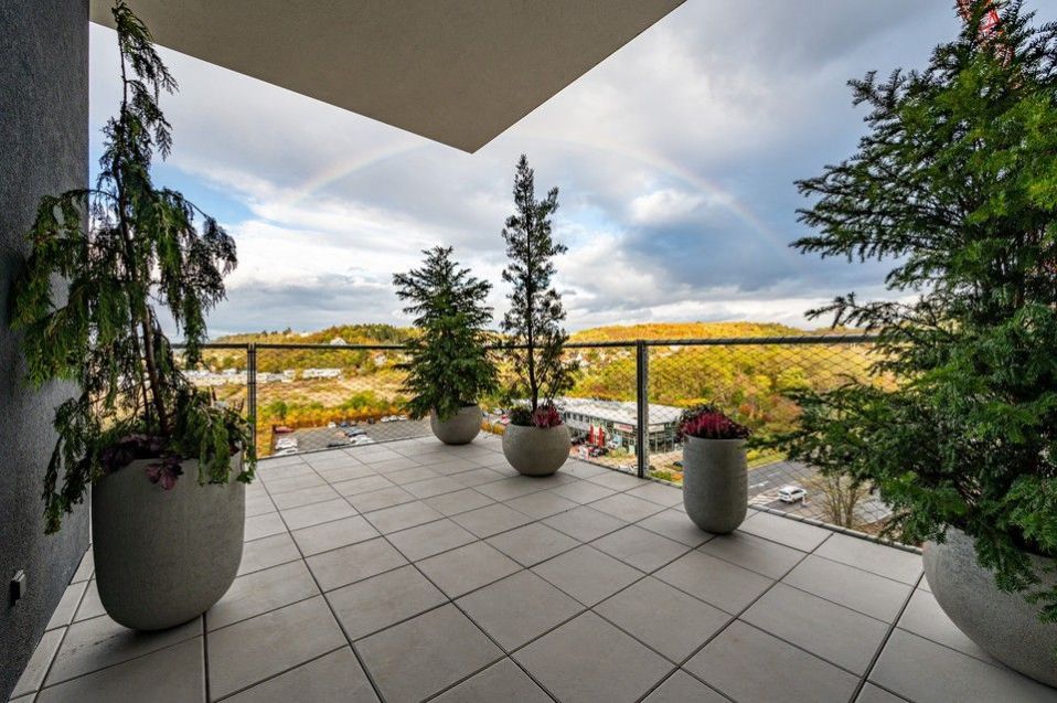 The layout of the 3+kk apartment includes an entrance area, an open, generous space of a living room with a kitchen in gray design and a dining room with direct access to a terrace with seating and views of Prague, as well as a bedroom on the upper floor, a bathroomlinen, (bathtub, shower), separate toilet, bidet, sufficient amount of storage space.