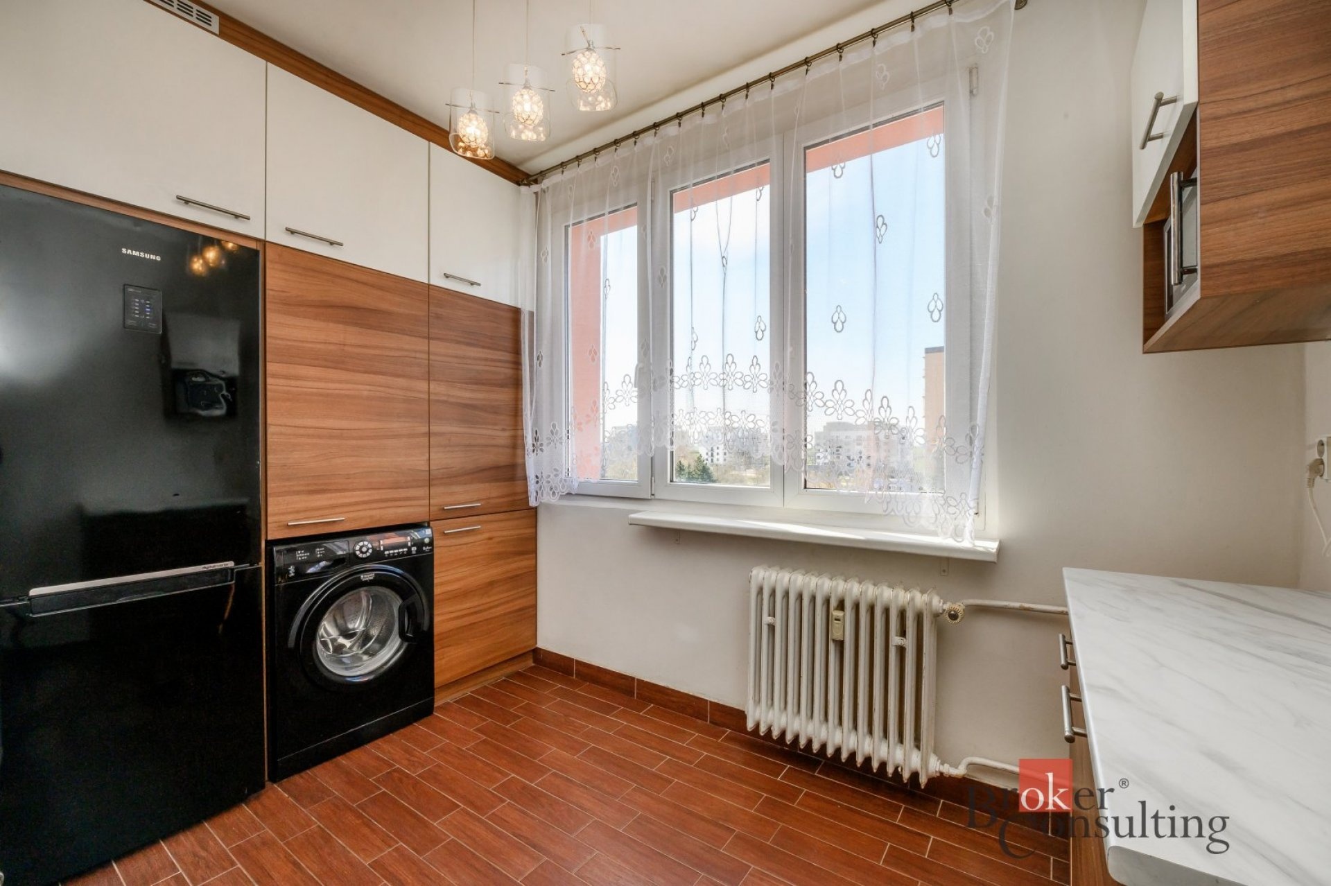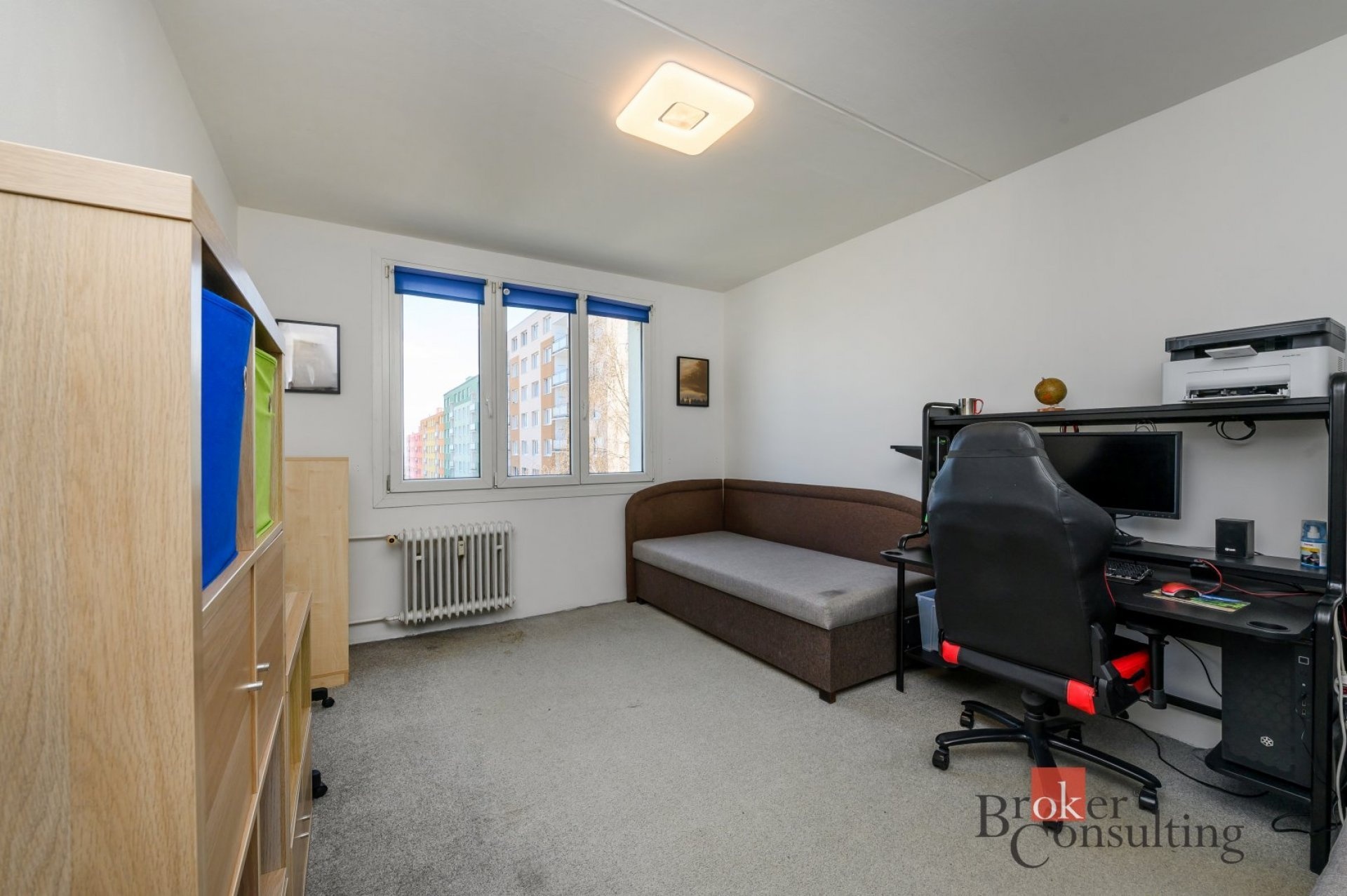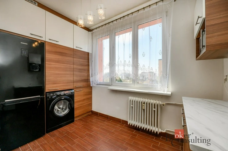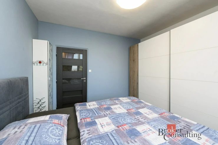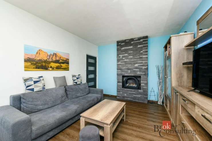 Dispozice bytu zahrnuje kuchyň, prostorný obývací pokoj, ložnici, samostatný pokoj a koupelnu s WC. V obývacím pokoji se nachází krb na biolíh, který vytváří příjemnou atmosféru a dodává interiéru moderní prvek.