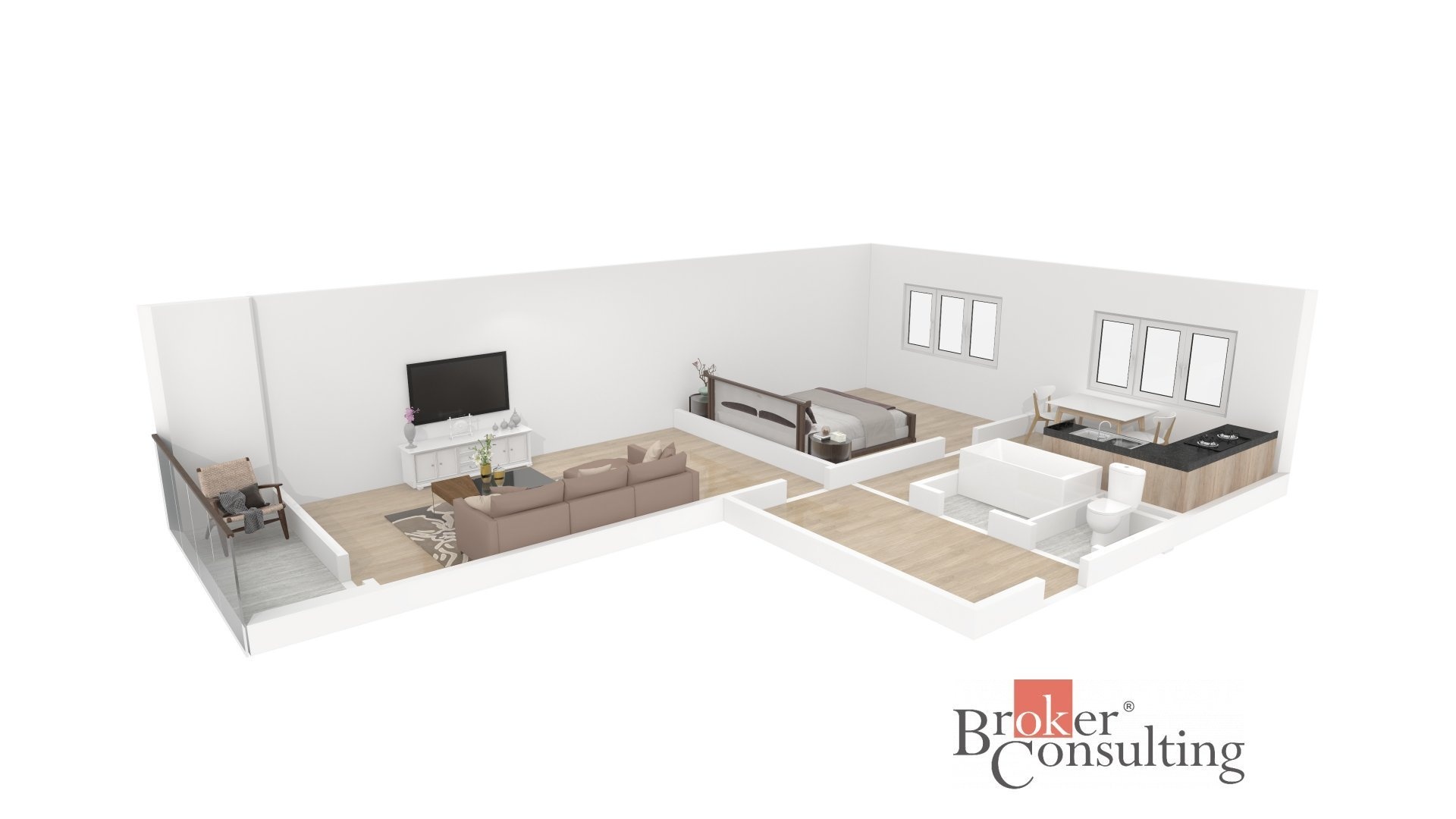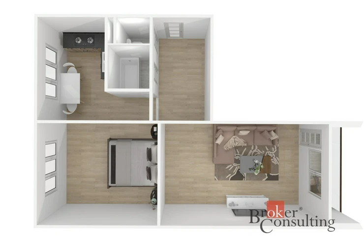 Dispozice zahrnuje dva samostatné pokoje, kuchyň, koupelnu a WC.