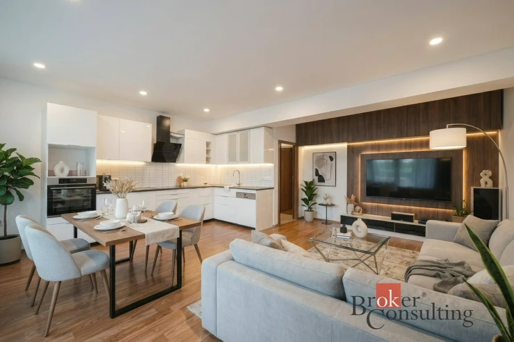 Samotný byt má dispozici 3+kk a podlahovou plochu 78,3 m². Dominantou je prostorný obývací pokoj s kuchyňským koutem, odkud vedou francouzská okna přímo na zahradu. Nechybí ložnice, dětský pokoj, koupelna s vanou a dvěma umyvadly ani samostatné WC. Prakticky řešená chodba nabízí dostatek místa pro úložné prostory a k bytu náleží i zděný sklep.