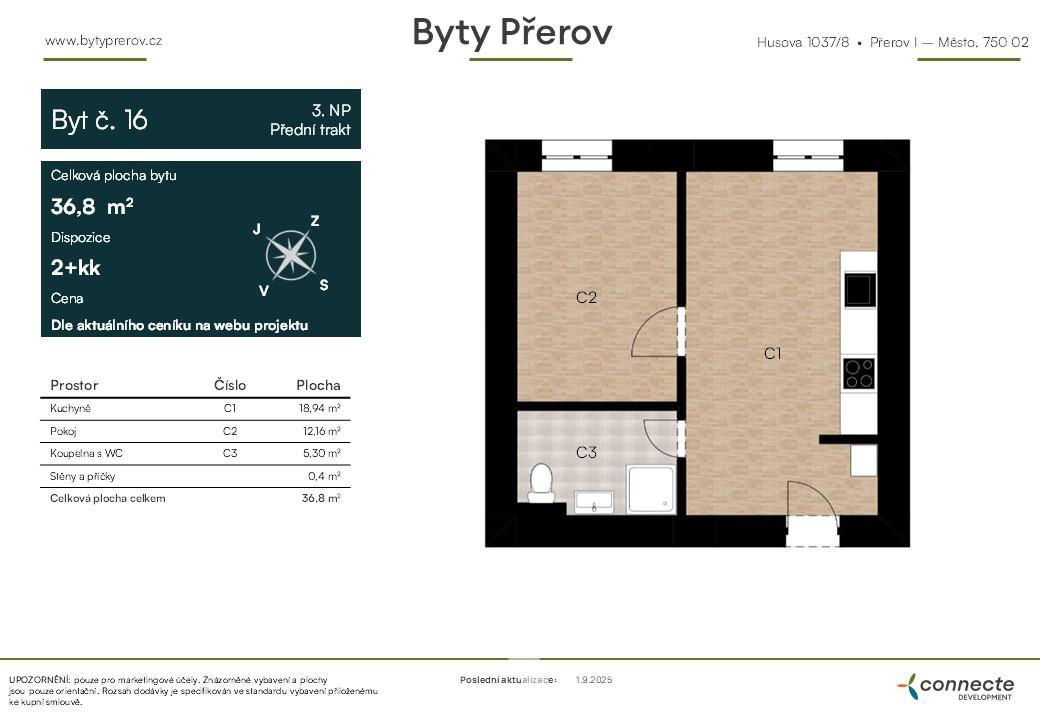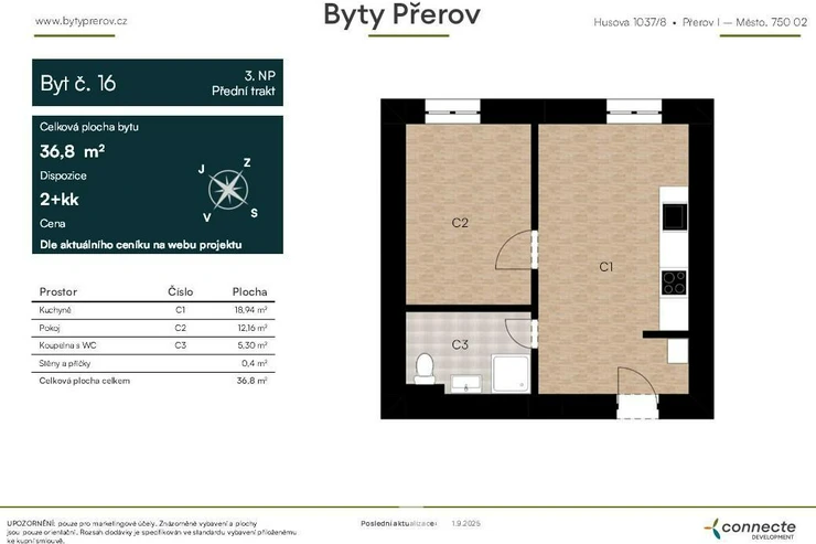As part of the Byty Přerov development project, we exclusively offer for sale a modern 2+kk apartment with a total area of 40.3 m2, situated on the 3rd floor, into private ownership.