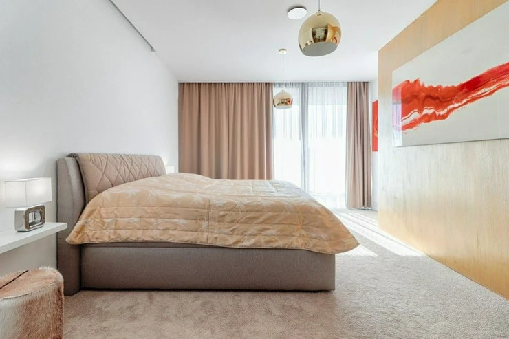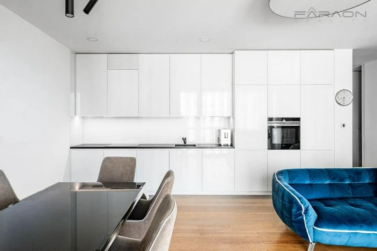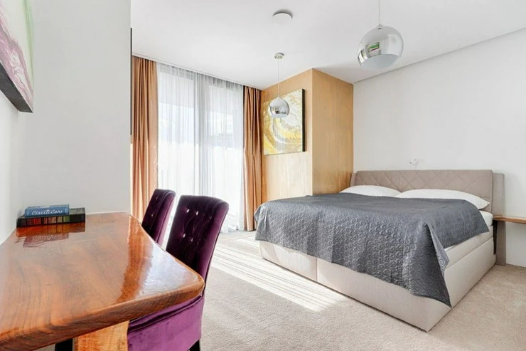The above-standard and completely complete equipment includes a luxurious Hanák kitchen unit in a white glossy design with all SIEMENS appliances, a Miele dishwasher, custom-made built-in wardrobes. Luxurious wooden oak floors in the living room with kitchen, carpets in the bedrooms, Carrara marble in the bathrooms and Villeroy and Boch fittings. Lighting throughout the apartment and remote-controlled exterior blinds. Dryer, washing machine.