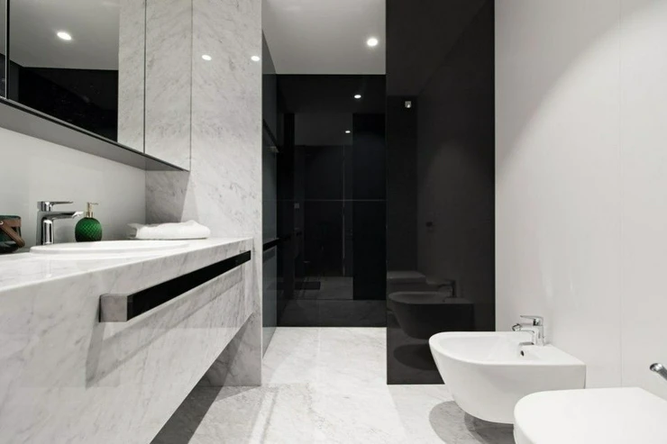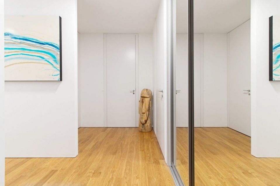 The layout of the 3-bedroom apartment includes an entrance hall, an open living room with a white-designed kitchen and dining room and direct access to the terrace, two separate bedrooms also with access to the terrace, two bathrooms, the first spacious bathroom (bath, shower, toilet, bidet), the second bathroom with a shower and toilet, another separate toilet, sufficient storage space, a cleaning room for a custom-made dressing room. The entire apartment is bordered by a walk-out terrace, which is accessible from all rooms.