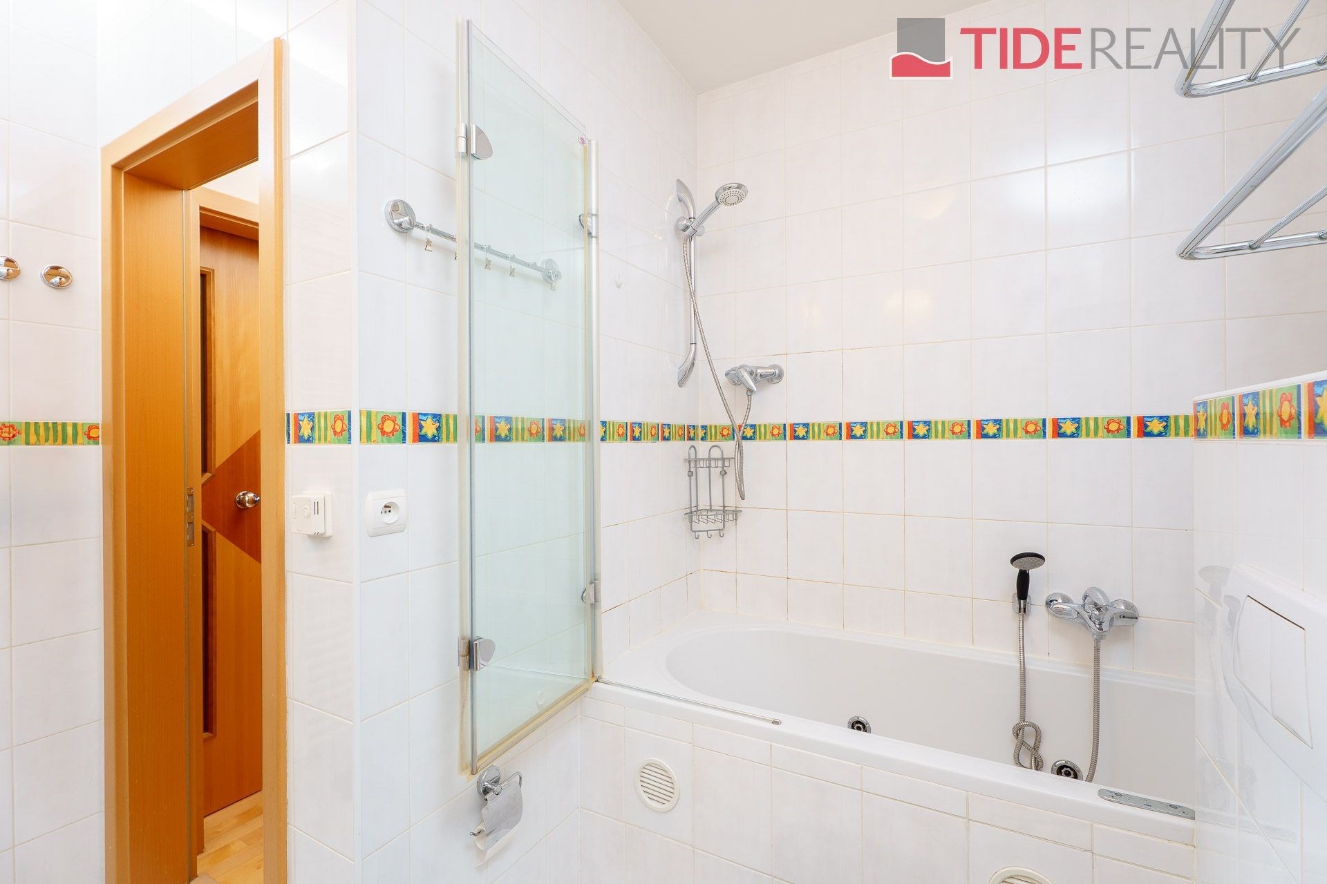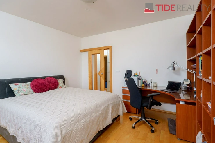 Za bezpečnostními vstupními dveřmi vcházíte do předsíně (18m2) se samostatnou šatnou a s vestavěnou skříní. Z centrální chodby jsou vstupy do všech místností v bytě: do třech prostorných ložnic (18, 17 a 16m2), koupelen a dále do velmi světlého obývacího pokoje s kuchyní (34m2) propojeného s balkonem (2m x 4,8m), kam se vejdou i pohodlná křesílka a případně i gril. Všechny ložnice orientované na sever do zeleně nabízí uklidňující a ničím nerušený výhled do lesoparku a především klidný spánek při otevřeném okně. Tento byt má dále k dispozici 2 koupelny. Koupelna se sprchou, umyvadlem a WC se nachází u hlavní ložnice, ostatní pokoje (dětské pokoje) sousedí s koupelnou vybavenou vanou, dvěma umyvadly, WC a přípojkami na na pračku a sušičku. V celém bytě jsou dřevěné plovoucí podlahy, dř. EURO okna s vnitřními žaluziemi a klimatizace DAIKIN se splitovou jednotkou umístěnou v centrální chodbě a obývacím pokoji.