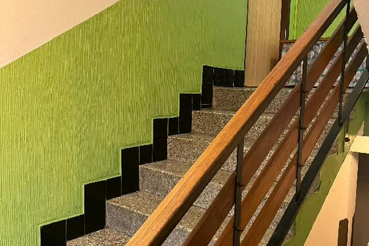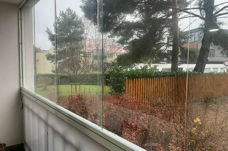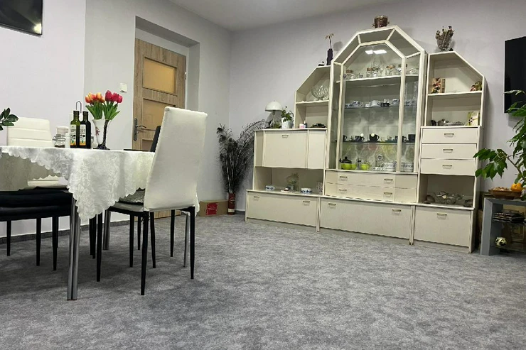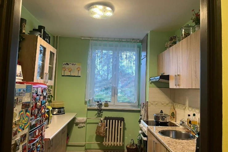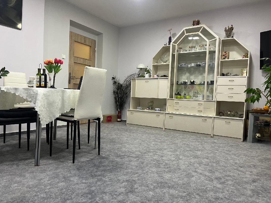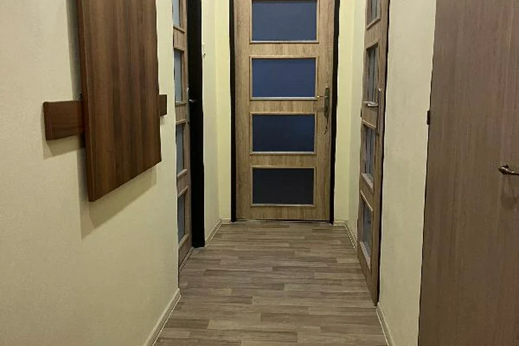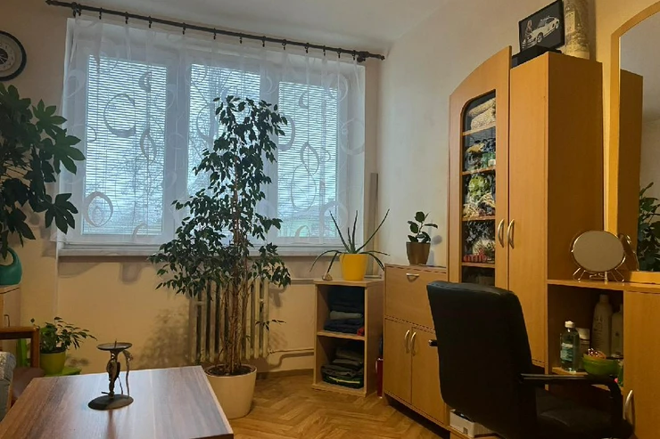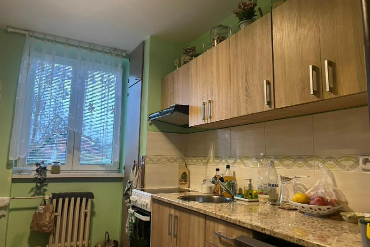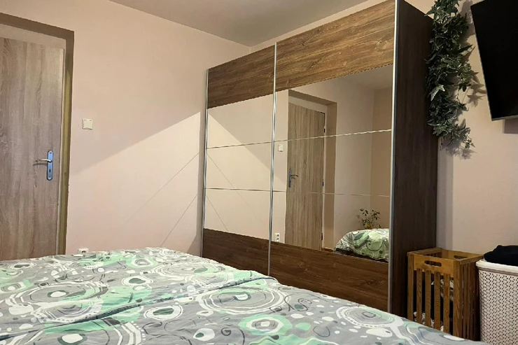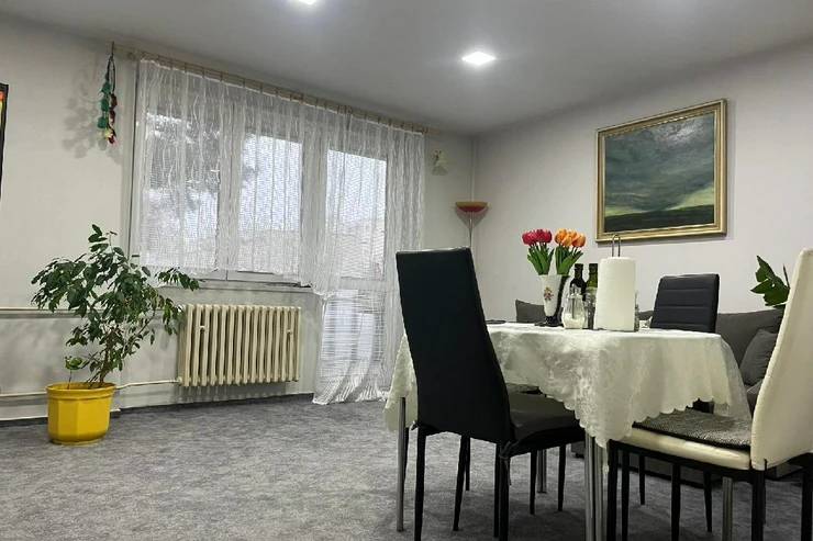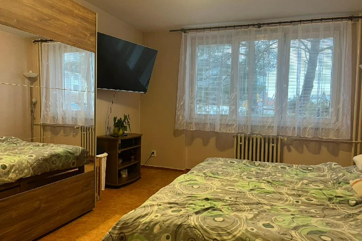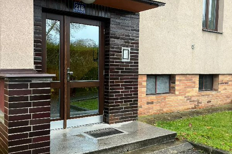 Byt se nachází ve zvýšeném přízemí bez výtahu s výhledem do zeleně a je členěn na vstupní chodbu, samostatnou toaletu, koupelnu se sprchovým koutem, obývací pokoj, dvě ložnice, kuchyň a balkon. Pokoje jsou neprůchozí. Prostorný zděný sklep se nachází v suterénu, balkon je zasklen. Byla zde provedena kompletní rekonstrukce, nová elektroinstalace, zděné jádro, dveře, podlahy, nová omítka, sádrokartonové stropy aj. Dům prošel revitalizací, je zateplen, okna jsou plastová.