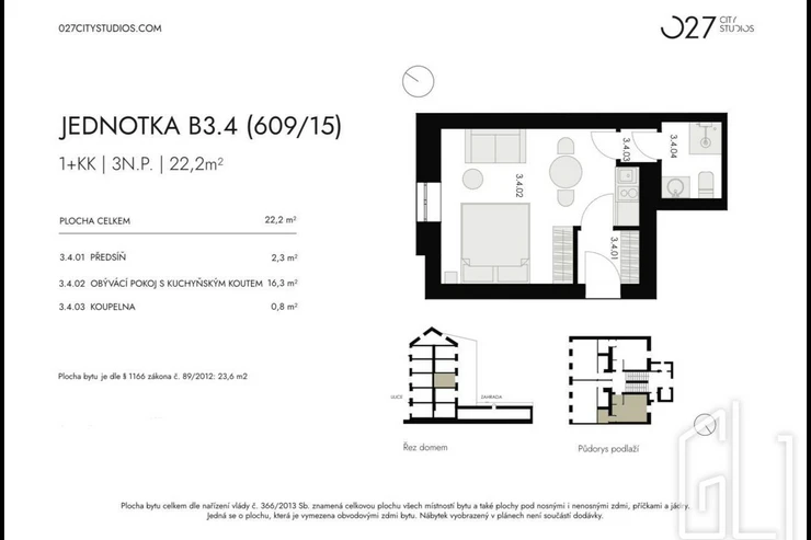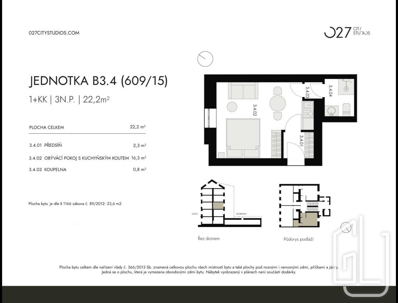 Jednotka č. 15 o výměře 23,6m2 se nachází v 3. nadzemním podlaží renovovaného cihlového domu s výtahem v ulici Ondříčkova, Praha 3. Dispozice 1+kk nabízí světlý obytný prostor s kuchyňským koutem, koupelnu se sprchou a toaletou. Byt je orientován na severozápad do vnitrobloku. K jednotce náleží sklepní kóje o ploše 0,8m2.