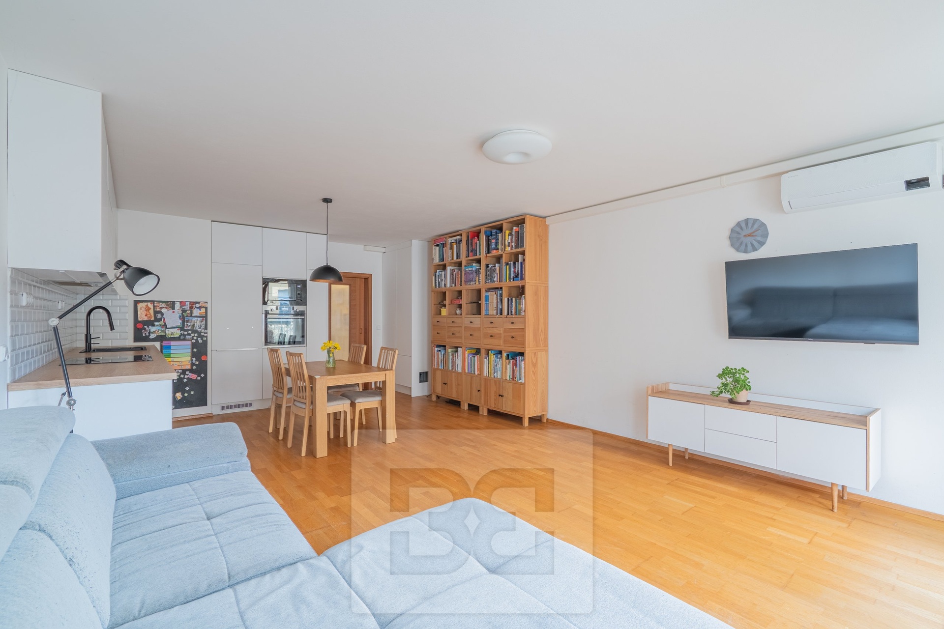 The main feature of the apartment is a generous living room with a kitchenette (34.2 m²), providing direct access to a 7.32 m² balcony. The balcony is southwest-facing. An air conditioning unit is located on the balcony. The kitchen, including appliances, was renovated in 2021.