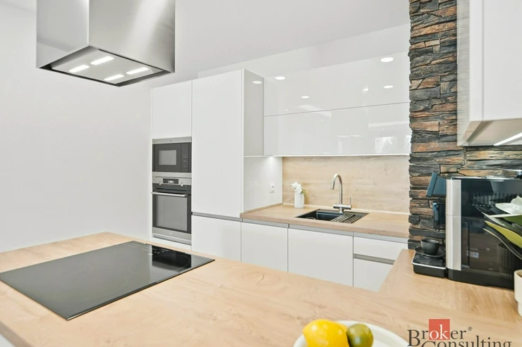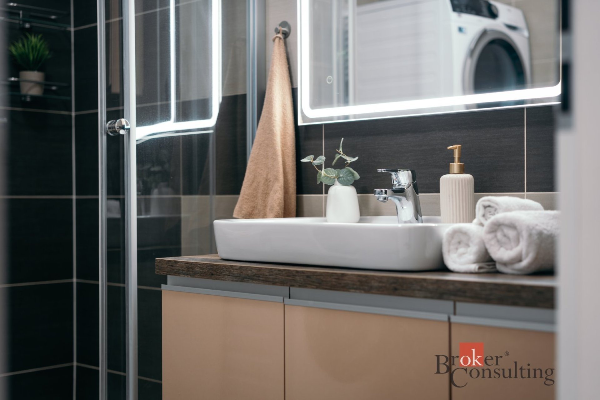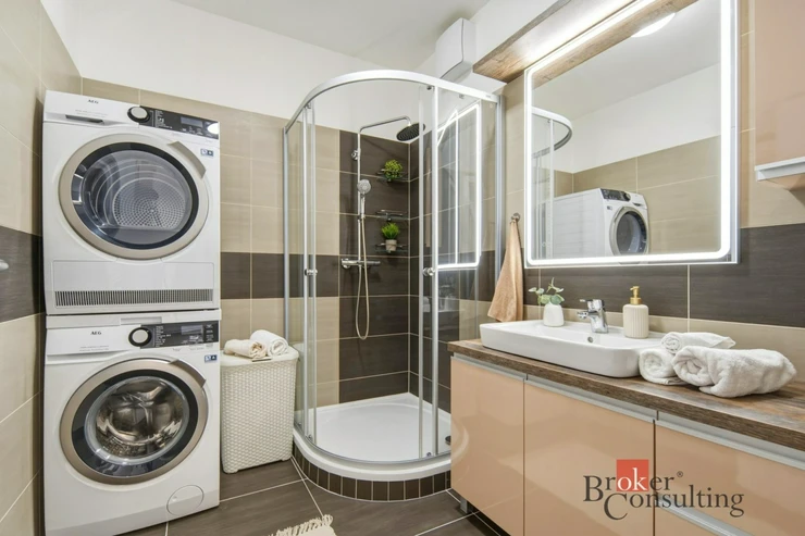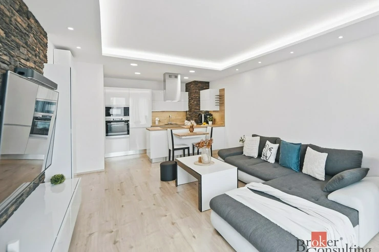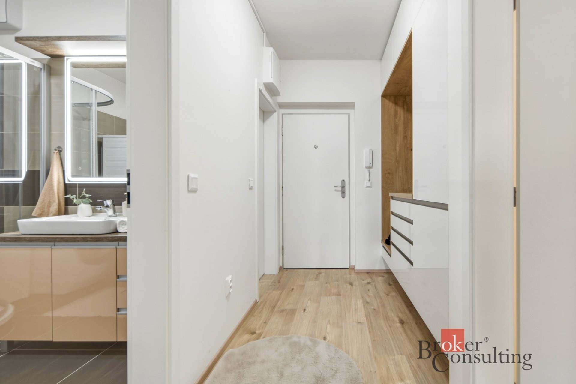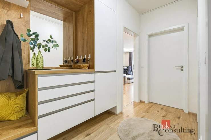 Byt zaujme na první pohled svým moderním designem, vzdušností a důrazem na detail. Dominantou je prostorný obývací pokoj propojený s kuchyní vyrobenou na míru, která nabízí řadu chytrých a praktických prvků jako filtrace vody, rozkládací stůl, designové LED s možností regulace intenzity či elegantní držáky na víno. Na kuchyň navazuje jednotný nábytek v předsíni, což podtrhuje čistý a nadčasový styl interiéru.