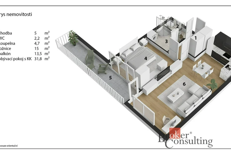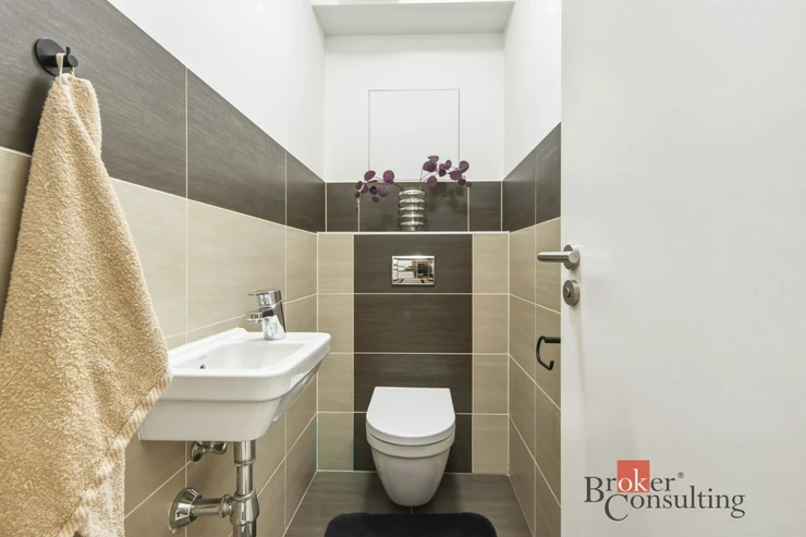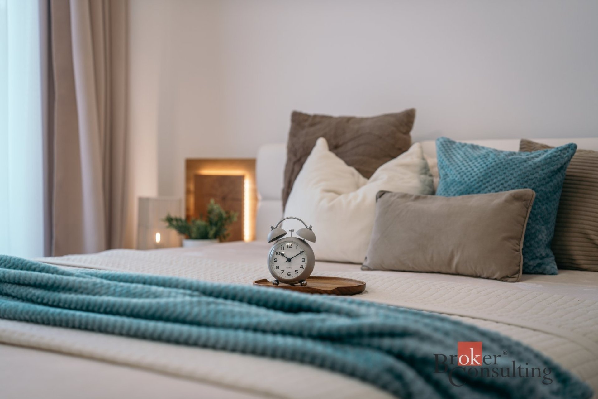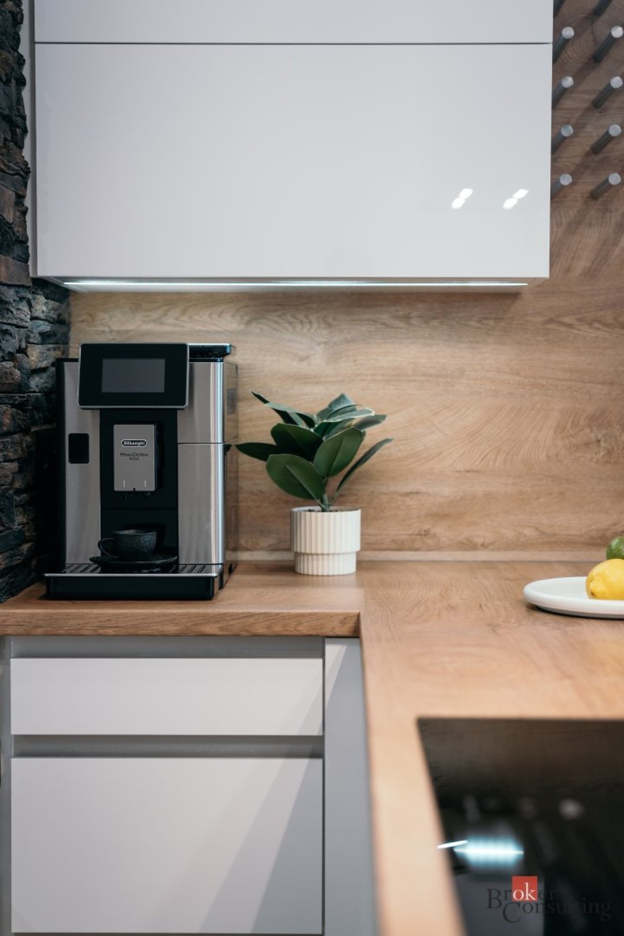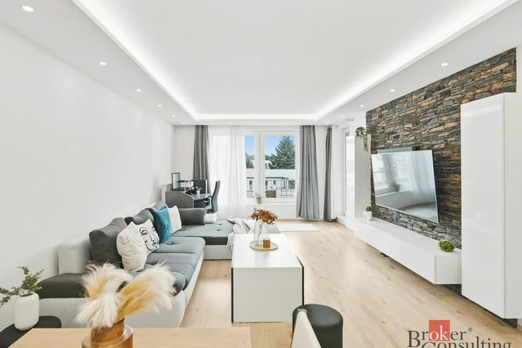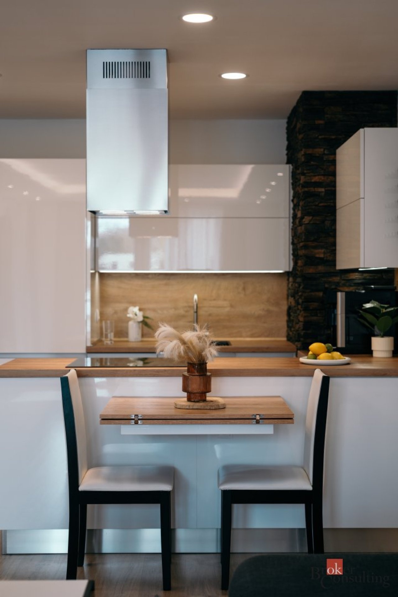 Byt zaujme na první pohled svým moderním designem, vzdušností a důrazem na detail. Dominantou je prostorný obývací pokoj propojený s kuchyní vyrobenou na míru, která nabízí řadu chytrých a praktických prvků jako filtrace vody, rozkládací stůl, designové LED s možností regulace intenzity či elegantní držáky na víno. Na kuchyň navazuje jednotný nábytek v předsíni, což podtrhuje čistý a nadčasový styl interiéru.