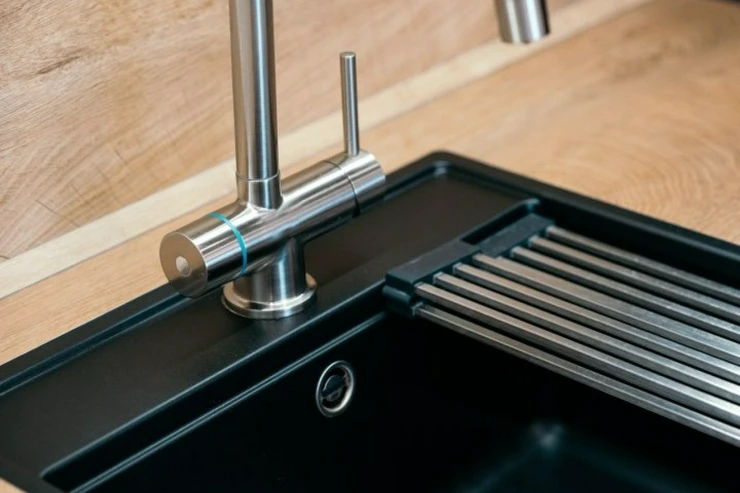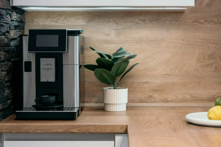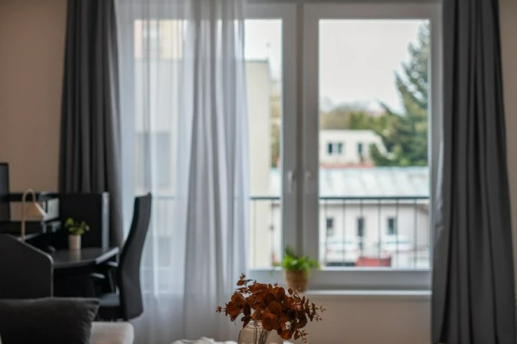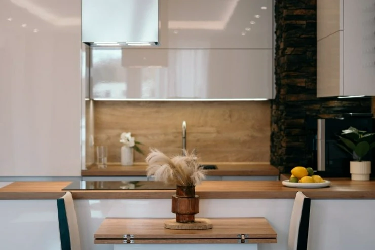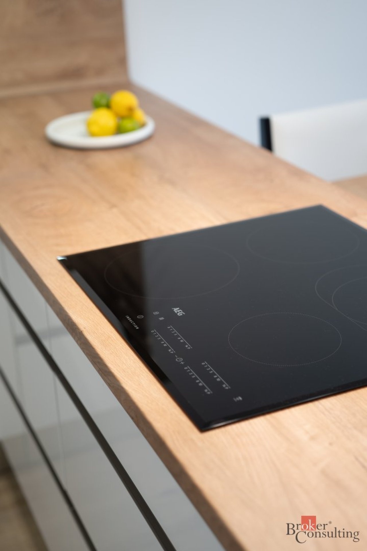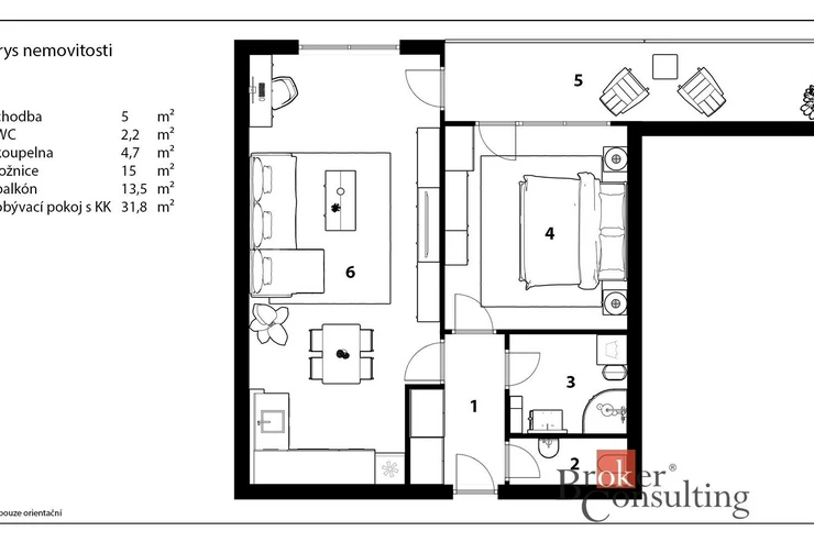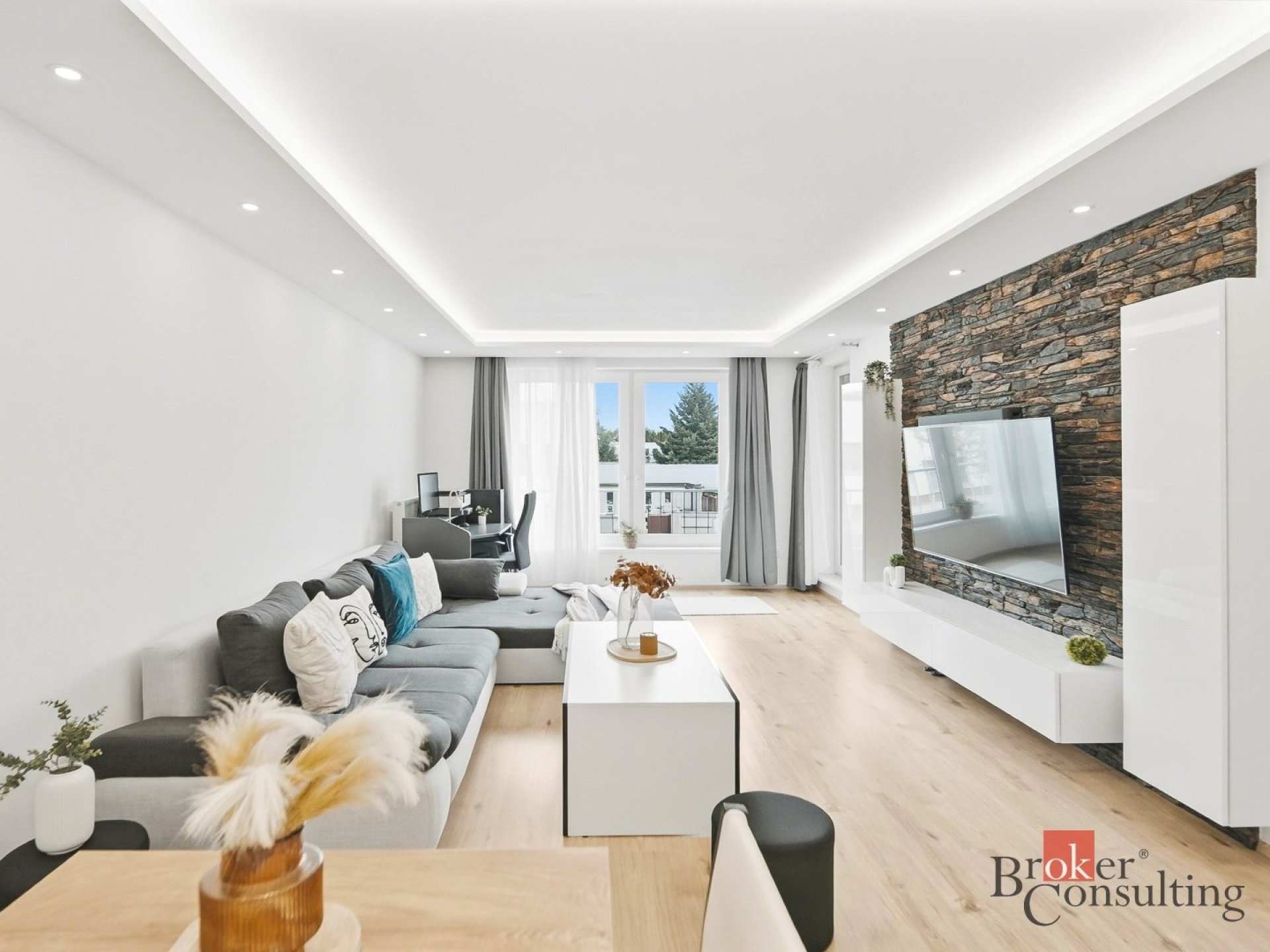 Byt zaujme na první pohled svým moderním designem, vzdušností a důrazem na detail. Dominantou je prostorný obývací pokoj propojený s kuchyní vyrobenou na míru, která nabízí řadu chytrých a praktických prvků jako filtrace vody, rozkládací stůl, designové LED s možností regulace intenzity či elegantní držáky na víno. Na kuchyň navazuje jednotný nábytek v předsíni, což podtrhuje čistý a nadčasový styl interiéru.