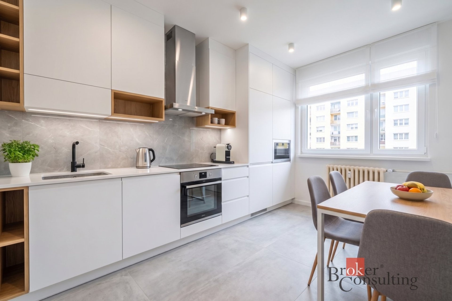 Interiér bytu tvoří tři samostatné pokoje, kuchyň a neobvykle prostorná chodba, která dává celému prostoru vzdušnost. Velkou výhodou je samostatná komora přímo v bytě, kterou lze využít jako šatnu nebo skladovací prostor, čímž odpadá nutnost řešit úložné prostory v obytných místnostech. Koupelna a toaleta jsou oddělené. Z obývacího pokoje je vstup na lodžii orientovanou do vnitrobloku mezi okolní zástavbu. K bytu samozřejmě náleží také sklepní kóje.