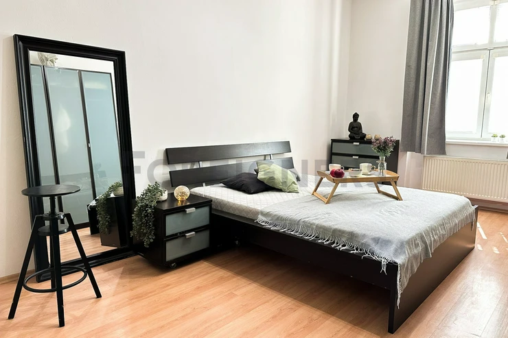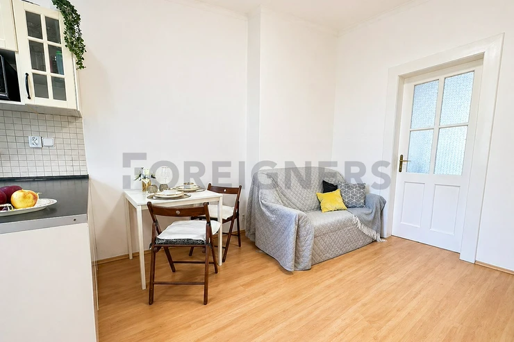 The layout of the apartment is practical and efficient. The living room with a kitchenette provides ample space for everyday living, while the separate bedroom ensures peace and privacy. The bathroom is equipped with a bathtub and a washing machine, and the toilet is separate, which significantly enhances living comfort. A major advantage is a practical pantry directly within the apartment, offering plenty of storage space, as well as a cellar storage unit located in the basement of the building. Residents also have access to a shared courtyard and it is possible to rent a dedicated parking space there.