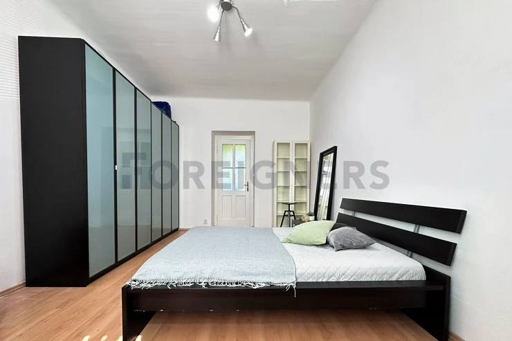 The apartment additionally features a small balcony facing a quiet inner courtyard. The kitchen windows are oriented in the same direction (northeast), while the bedroom windows face southwest toward 5. května Street.