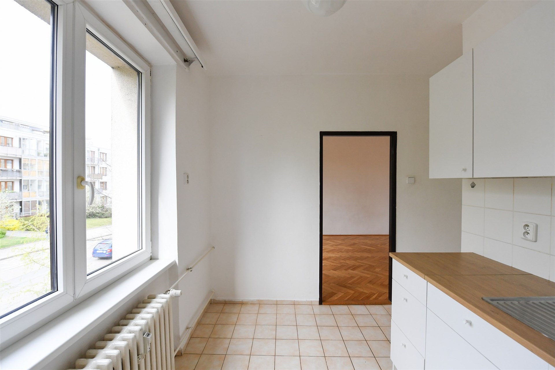 The apartment offers a practical layout with a living room and kitchen facing the street, while the bedroom is oriented towards a quiet, green area, ensuring both natural light and privacy.