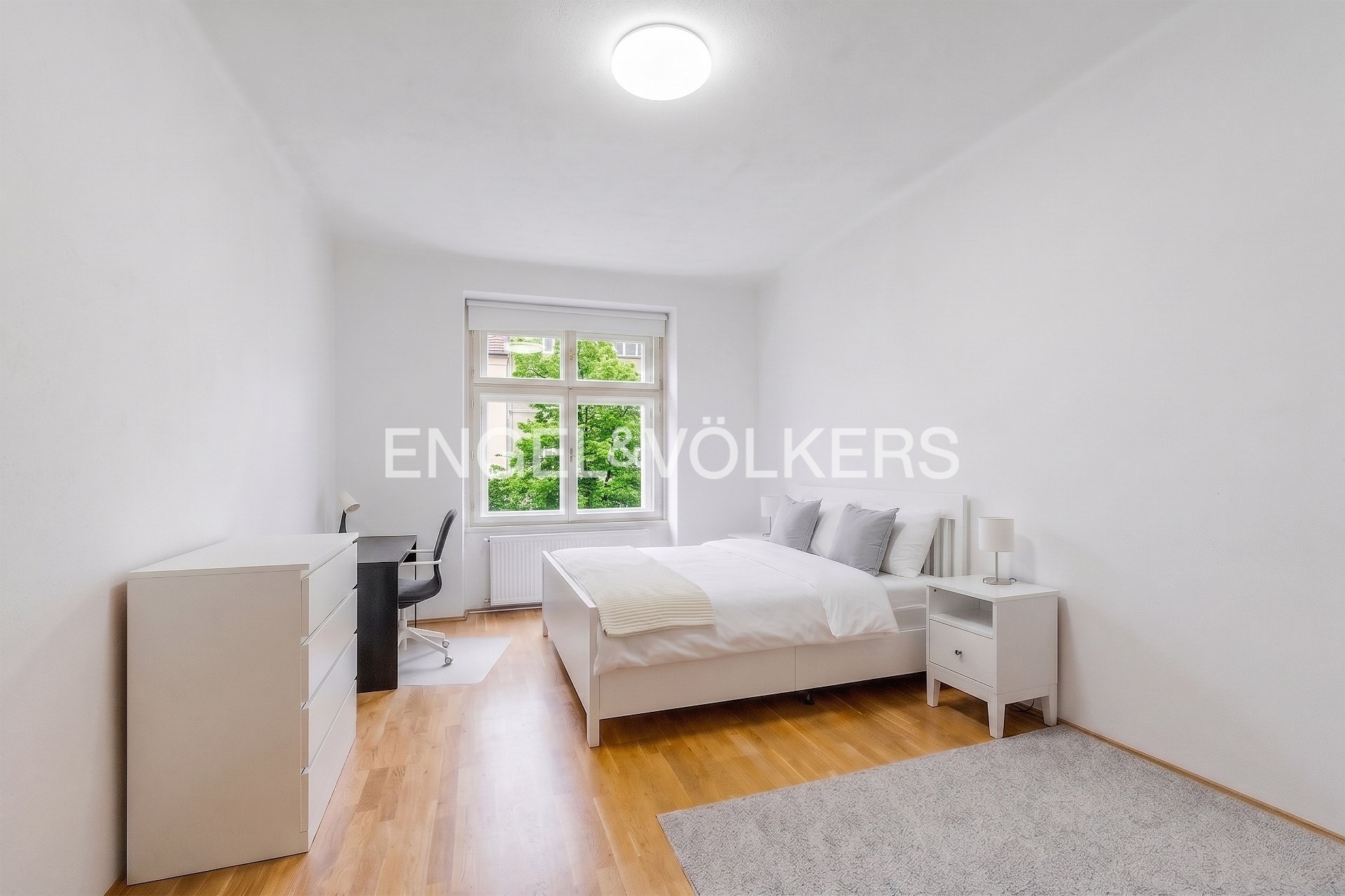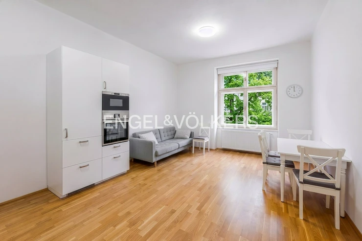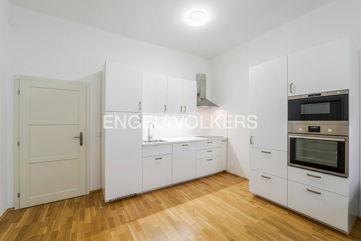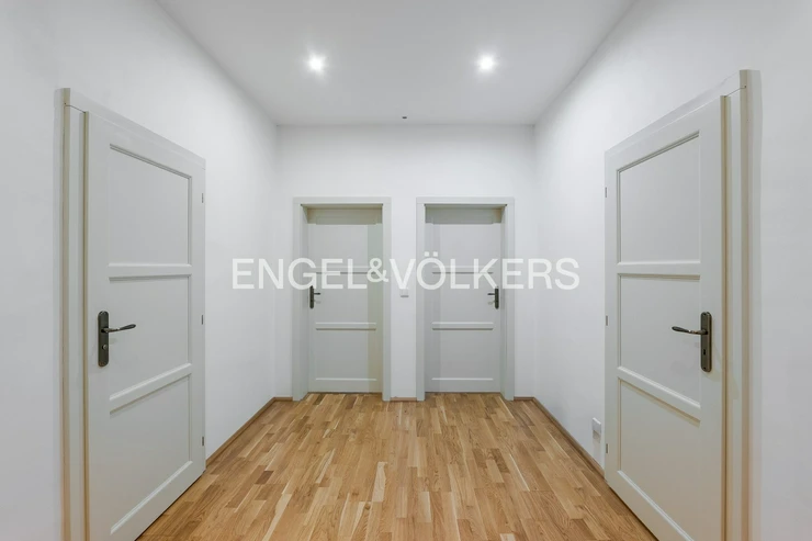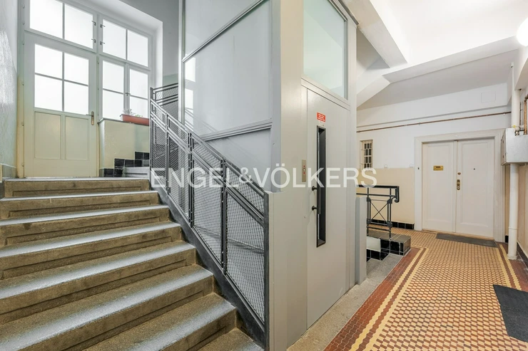 This bright 3+kt apartment is located in the attractive area of Prague's Vinohrady, adjacent to the popular Jiřího z Poděbrad Square. The apartment is situated on the 3rd floor (2nd floor above ground) of a historic corner residential building that is very well maintained and managed. The building has a renovated facade, roof, plumbing, cellars, and windows. Revitalization of the common areas is currently underway, including the replication of historical elements and new painting. Access to the apartment is practically barrier-free, as the building features an elevator that leads directly to the floor.