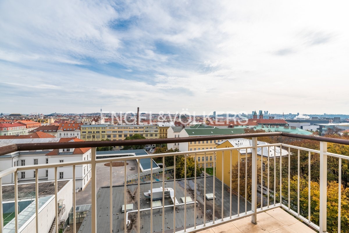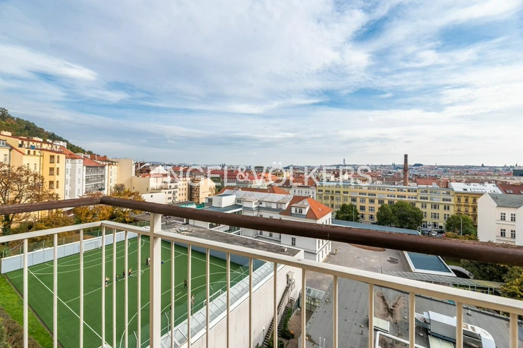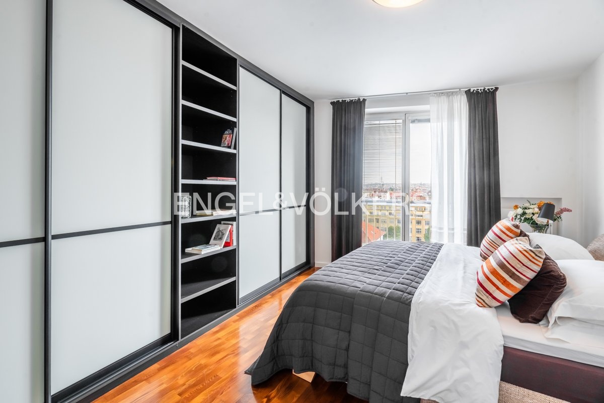 The apartment is situated on the top 4th floor of a very well-maintained, wheelchair-accessible building with an elevator and offers beautiful views of Prague. The layout includes an entryway with built-in closets, a living room with a 5 m² balcony and a custom kitchen, and a bedroom with additional built-in wardrobes. The apartment features two bathrooms with toilets, one of which is an en-suite with a bathtub and the other with a shower.