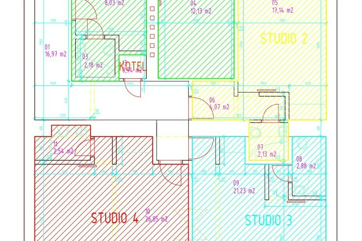 Každá jednotka má vlastní kuchyňku a sociální zařízení. Tato studia jde využívat zcela separátně. Povrchy stěn jednotky tvoří hladká omítka, v místnostech sociálního zázemí se nachází keramické obklady. Nášlapnou vrstvu podlah místností tvoří keramická dlažba.