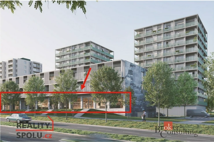 V projektu Byty Krašovská nabízíme k prodeji 8 nebytových prostorů v nižší budově označené jako B, kde má většina prostor výlohu směrem na hlavní třídu, ul. Studentská.