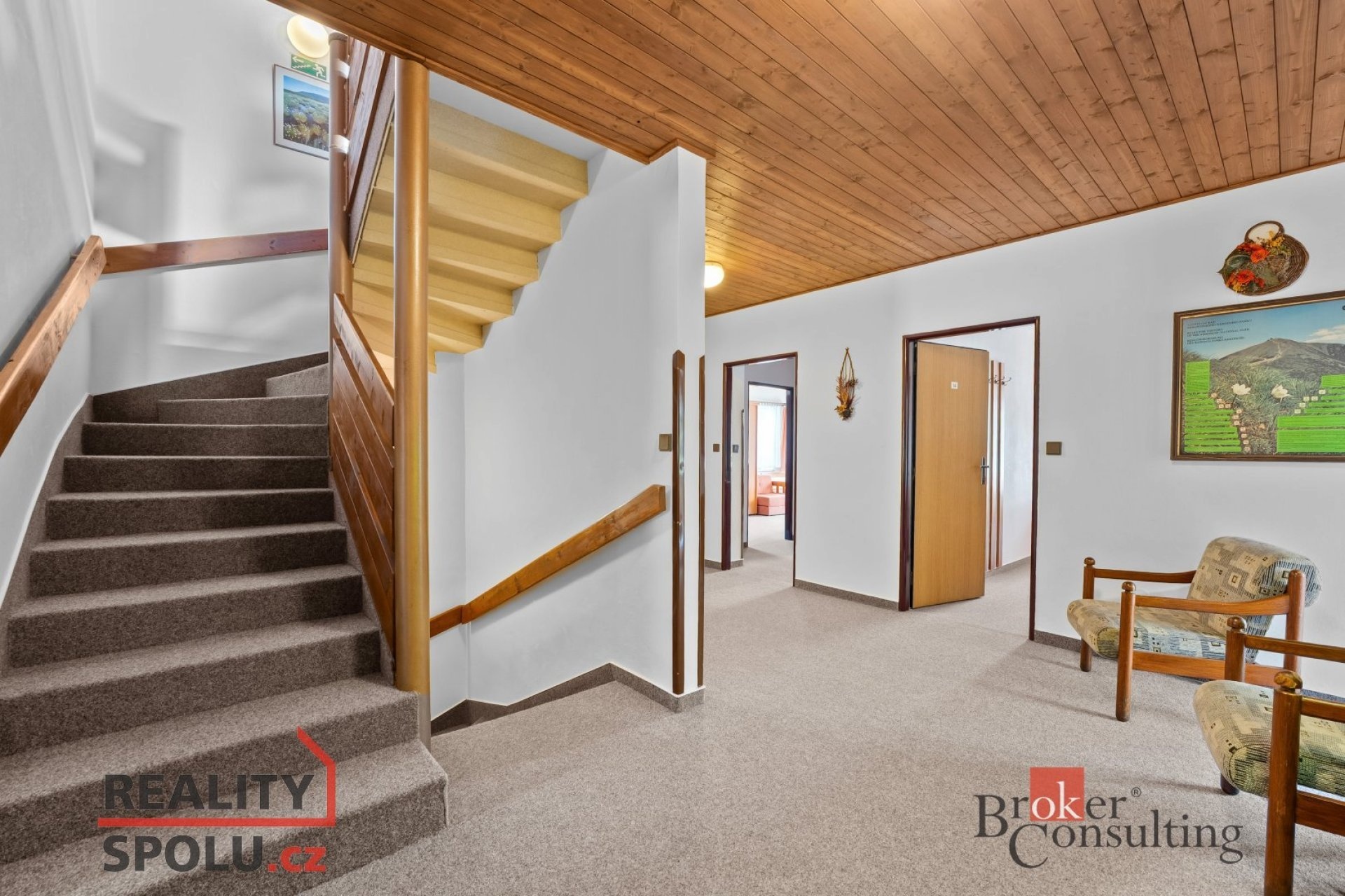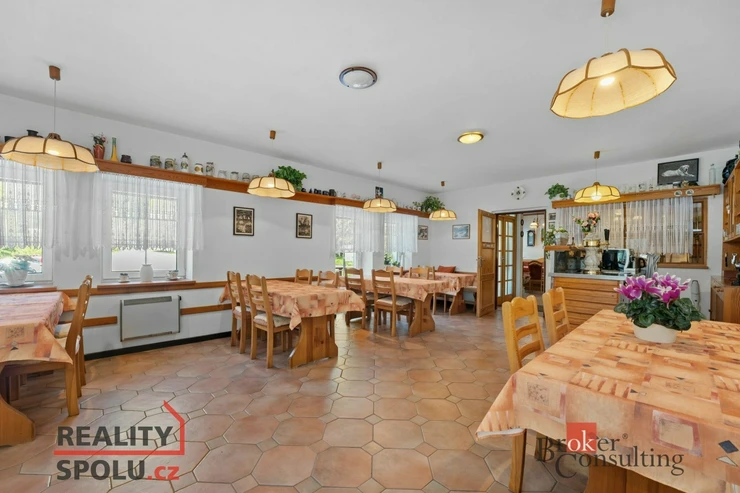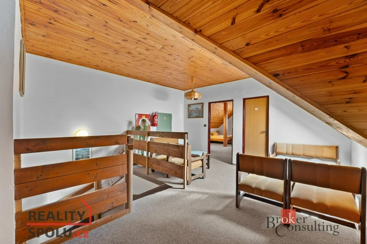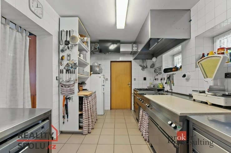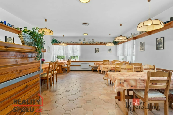 V 1. patře je vstup na terasu a další venkovní posezení je také v přízemí. Součástí objektu je garáž, dostatek parkovacích míst (10-12) a navíc samostatný prostor, dříve využívaný jako minimarket.