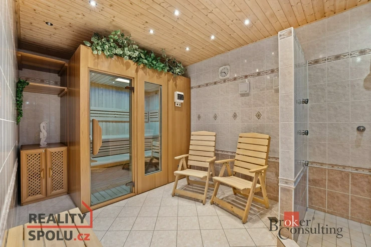 V přízemí najdete společné prostory, a to obývací kout s krbem, jídelnu s výčepem a kuchyň. Dále je tu také wellness místnost se saunou.