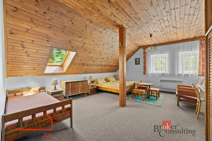V 1. a 2. patře se nachází hostinské pokoje, každý s vlastním sociálním zařízením a také je tu samostatná bytová jednotka, ta disponuje ložnicí, obývákem, dětským pokojem a koupelnou.