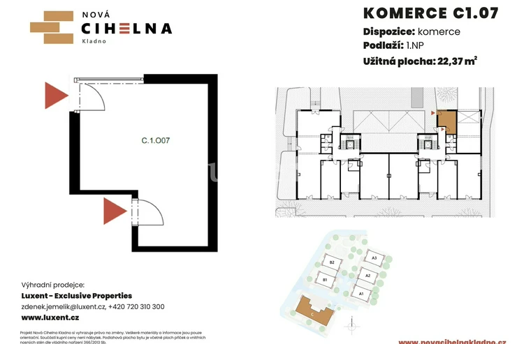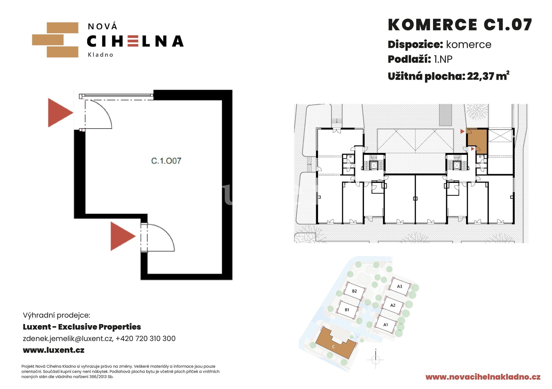 We offer for sale a commercial unit with a usable area of 22.37 sqm in an extremely economical development project Nová Cihelna Kladno, located in the urban area of Kladno - Rozdělov.