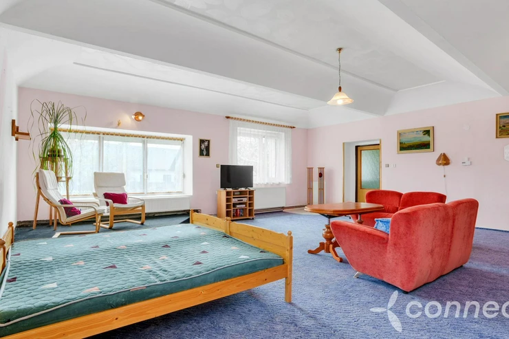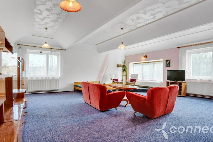 We offer for sale a house in the village of Hřibiny, which combines the advantages of extensive facilities, strategic location and the possibility of immediate and long-term use. The complex is ideal for entrepreneurs looking for a combination of commercial use and private facilities, or as an investment in accommodation or experience services.
