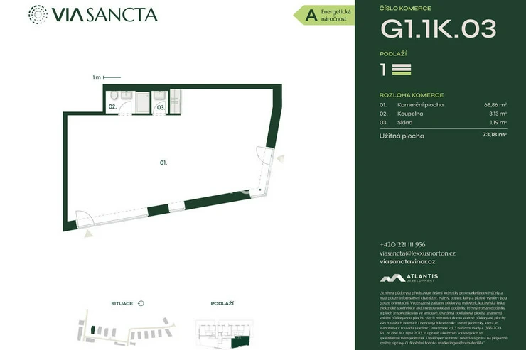 An attractive commercial unit with an area of 74.54 sqm right in the heart of the new Via Sancta district. The project will bring more than 400 new apartments, which means hundreds of potential customers in the immediate vicinity. This makes the space an ideal location for a shop, services, or a café.The main area of 68.86 sqm has two entrances, which ensures flexibility in layout and operation. There is a bathroom with a shower, a toilet, and a utility room measuring 1.2 m².The space is finished in Shell & Core condition and allows the interior to be fully customized to suit specific business plans. Garage and outdoor parking spaces are available as part of the project and can be purchased separately.The Via Sancta project represents a new standard of living. It combines modern architecture and cutting-edge technology with an emphasis on sustainability. It offers a wide range of apartments from one-bedroom to spacious three-bedroom, all with a balcony, terrace, or front garden.Modern technologies include heat recovery systems, retention tanks, heat pumps, and preparation for the installation of photovoltaic panels, which together ensure energy efficiency and increase living comfort. In addition, the apartments are equipped with smart home systems that enable efficient energy consumption management and ensure the comfort of residents.Via Sancta is suitable for all generations. The complex is surrounded by greenery with playgrounds and sports facilities. The surrounding area invites active recreation with a golf course and bike path in close proximity to the complex. Commercial spaces directly on the premises provide the necessary services, making Via Sancta an ideal place for modern living.The space is finished in Shell & Core condition and allows the interior to be fully customized to suit specific business plans. Garage and outdoor parking spaces are available as part of the project and can be purchased separately.Vinor is a quiet and picturesque part of Prague 9, which perfectly combines proximity to nature with urban amenities. It is known for its historical monuments and extensive natural areas, including Vinor Nature Park and Ctenický haj. Complete civic amenities are available for families and individuals, including schools, kindergartens, shops, and sports facilities.Thanks to excellent transport infrastructure, the center of Prague is easily accessible. The journey by car takes about 20 minutes, while regular bus connections will get you to the Letnany metro station in 10 minutes. Vinor is therefore an ideal place for those looking for quiet living with quick access to city amenities.
