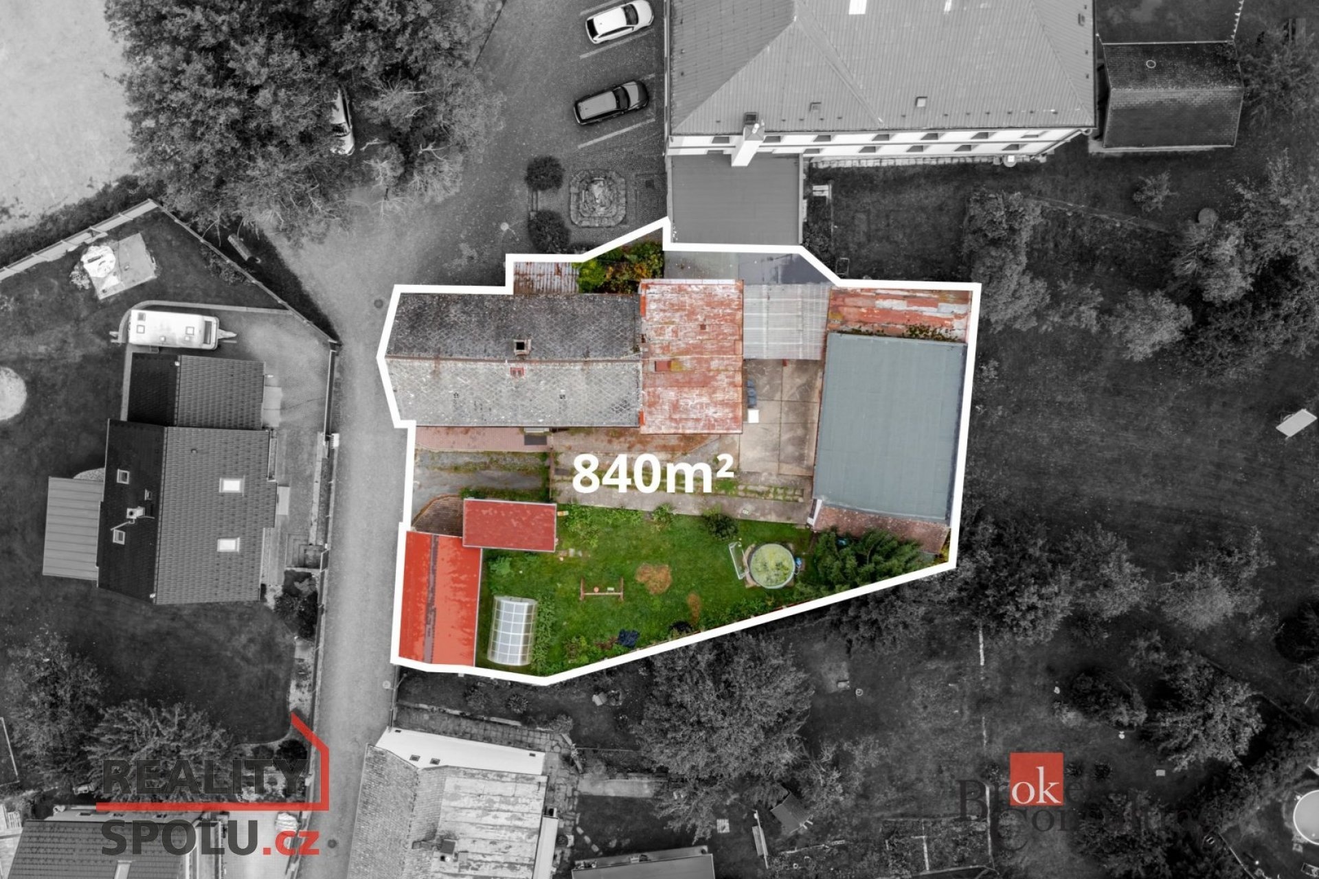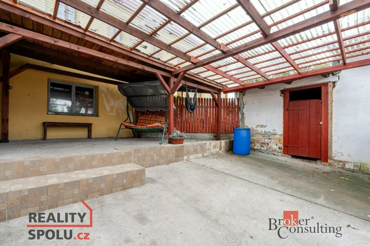 Na pozemku se nacházejí tři pergoly – dvě novější pro hosty, jedna původní u domu. V letních měsících zde bývalo oblíbené venkovní posezení. Součástí jsou také garáže s vysokými stropy, které lze přestavět na technické zázemí, úschovnu kol nebo další prostory pro hosty.