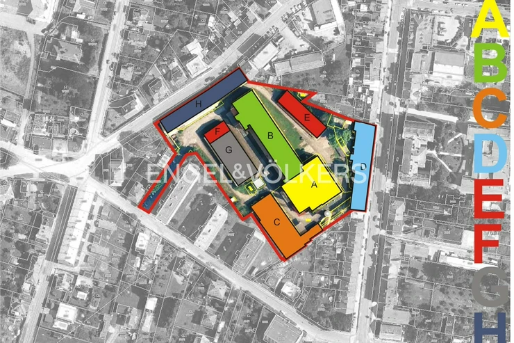 According to the study, there is 3,129 m² in building A (non-residential), 3,596 m² in building B (98 apartments), 386 m² in building B (9 non-residential units), building C is left as technical facilities (approx. 1,014 m²), building D has 812 m² (non-residential) and 439 m² (8 residential units), and building H has approx. 758 m² (non-residential space).