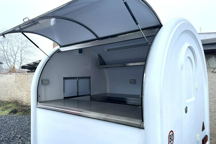 Nabízíme k prodeji zánovní Food Truck, k užívání jako pojízdná kavárna, pojízdný stánek s občerstvením. Stánek má plechové opláštění s rozměry 230/ 200/ 200, a elektrické připojení 230/380 V. Vybaven je nerezovými stoly z obou stran a umyvadlem s baterií. Barva opláštění je bílá a lze ho transportovat za autem s připojením tažného zařízení. Pro více informací prosím o osobní kontakt.