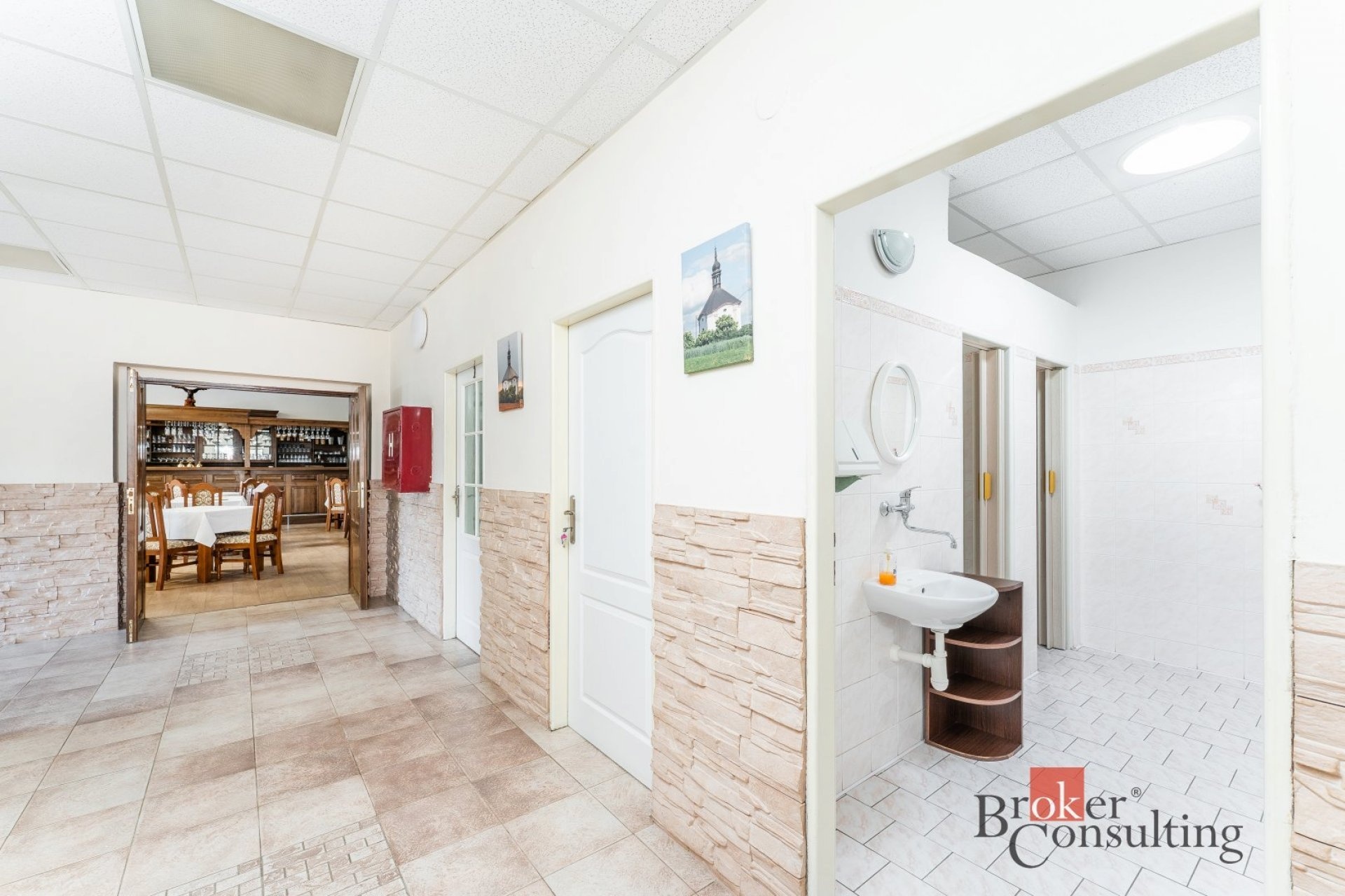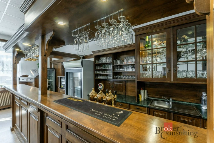 Hlavní budovu tvoří prostorná restaurace s velkým sálem s kapacitou přibližně 60–80 hostů. Interiér je světlý a velmi dobře udržovaný. Dominantou prostoru je stylový dřevěný bar s výčepem a kompletním zázemím pro restaurační provoz. Na hlavní sál navazuje samostatný salonek vhodný pro soukromé akce nebo menší společenské události.