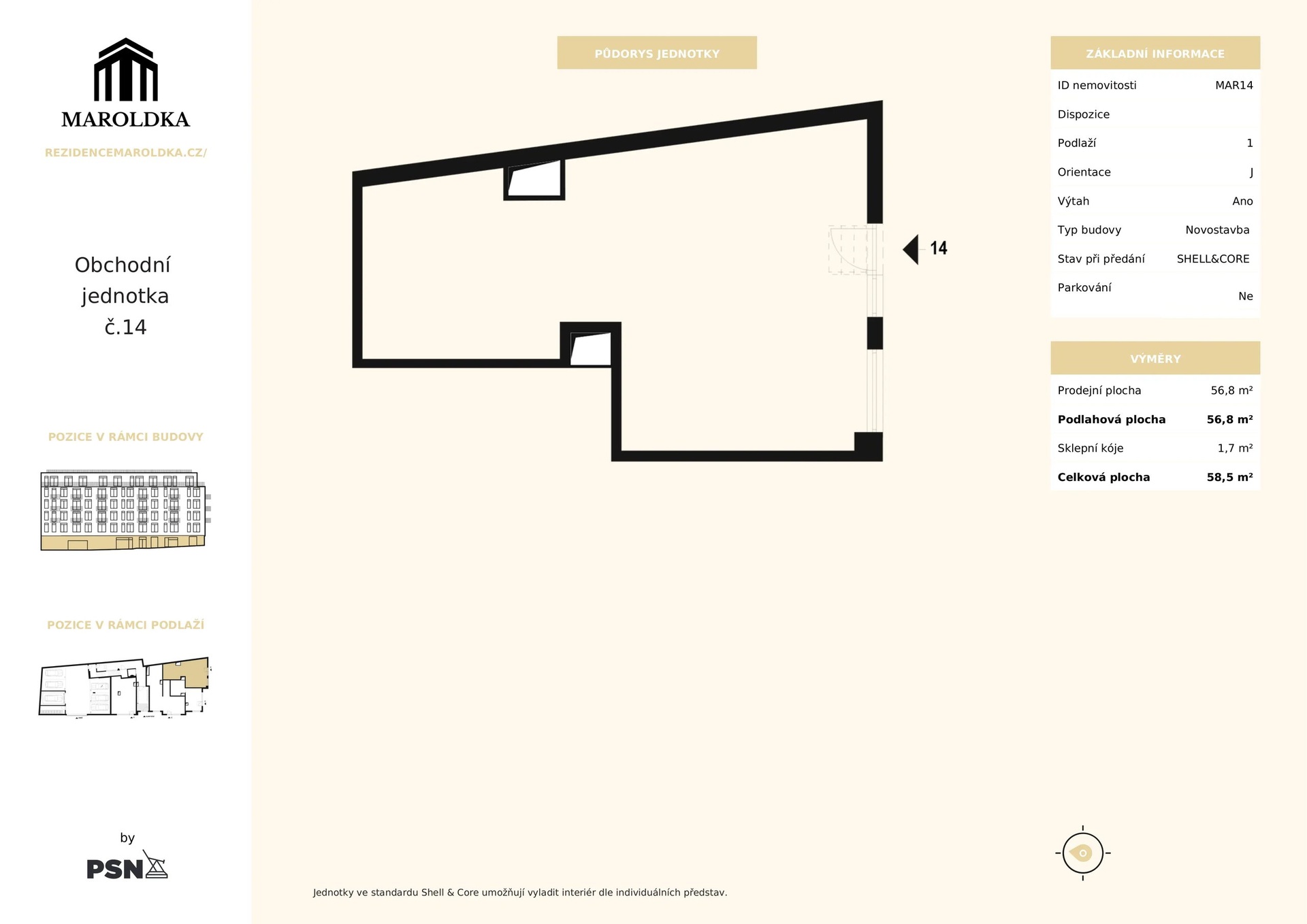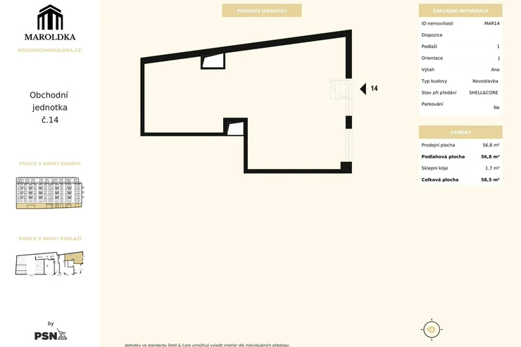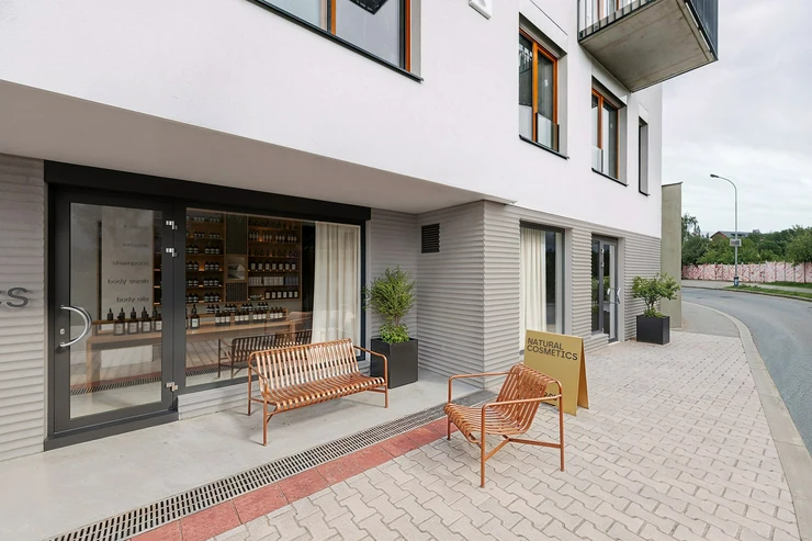 Retail unit no. 14 with a total area of 58,5 m² is located on the ground floor of the building. The bright space with a view facing the street is ideal for a shop, services, or a smaller gastro establishment. The unit will be handed over in a shell & core state, ready for technical connections and final adjustments according to the wishes and needs of the future tenant or owner.