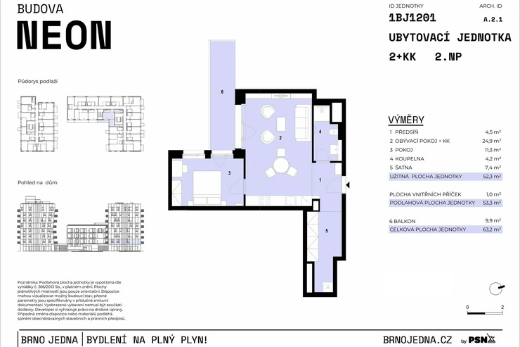 Brno Jedna, or Brno One, is more than just a residential building, it is a place where you will live well. The building boasts a roof terrace with a grill, a workout zone, a bike room, a laundry room, and a stroller room - all of which will offer you the comfort of urban life. A new district with a park, bike paths, and services is developing nearby. The city center is within reach in just 5 minutes by public transport or by car.