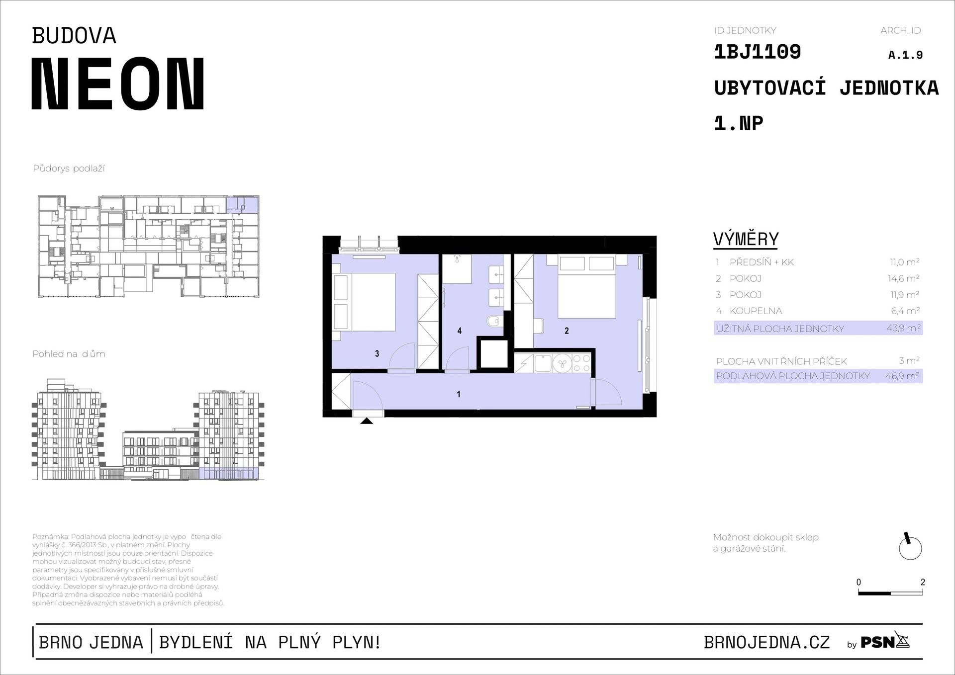 The space will be ready to move into with high standards – triple-glazed windows, finished floors, equipped bathroom, and space prepared for the installation of a kitchen unit. Preparation for outdoor shading is available. A basement storage unit and parking space must be purchased with the unit. The Neon&Xenon building represents modern living with complete facilities and excellent accessibility, offering a wide range of residential services: a roof terrace with a barbecue, a workout zone, laundry rooms, a common room, a café, a bicycle storage room, and a stroller storage room. The building will be part of the newly emerging Brno Jedna district with a square and adjacent park, bike paths, sports facilities, and other services. You can reach the city center in 5 minutes by public transport or car. The completion date for construction and handover of the units is the end of 2027
