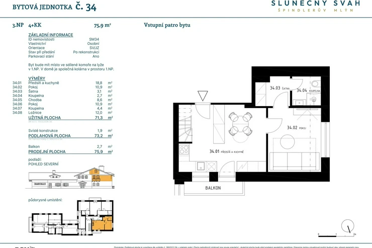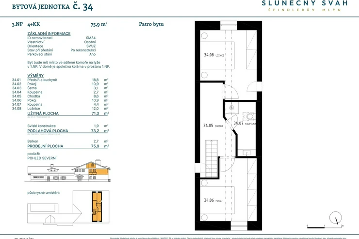 This four-room duplex apartment in the Sunny Slope project is an ideal choice for those looking for a high standard, spacious mountain retreat. The residence is situated in a quiet location above the center of Špindlerův Mlýn and combines the charming traditional Krkonoše character with modern architecture and technology.