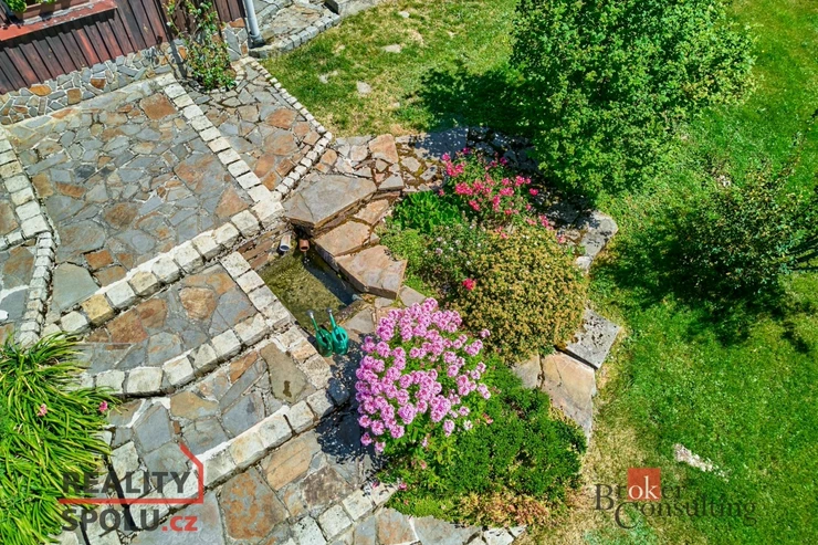 Slunná zahrada o velikosti 4516 m2 je krásně udržována a dle ÚP vedená jako smíšené obytné plochy s rekreací -SR. Nachází se zde sezení s krásným výhledem.