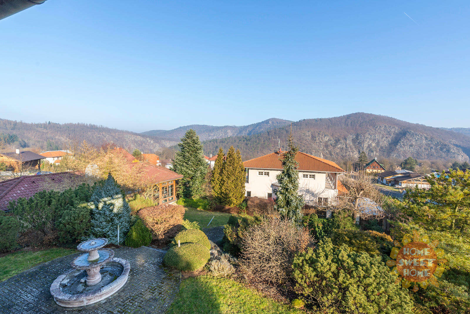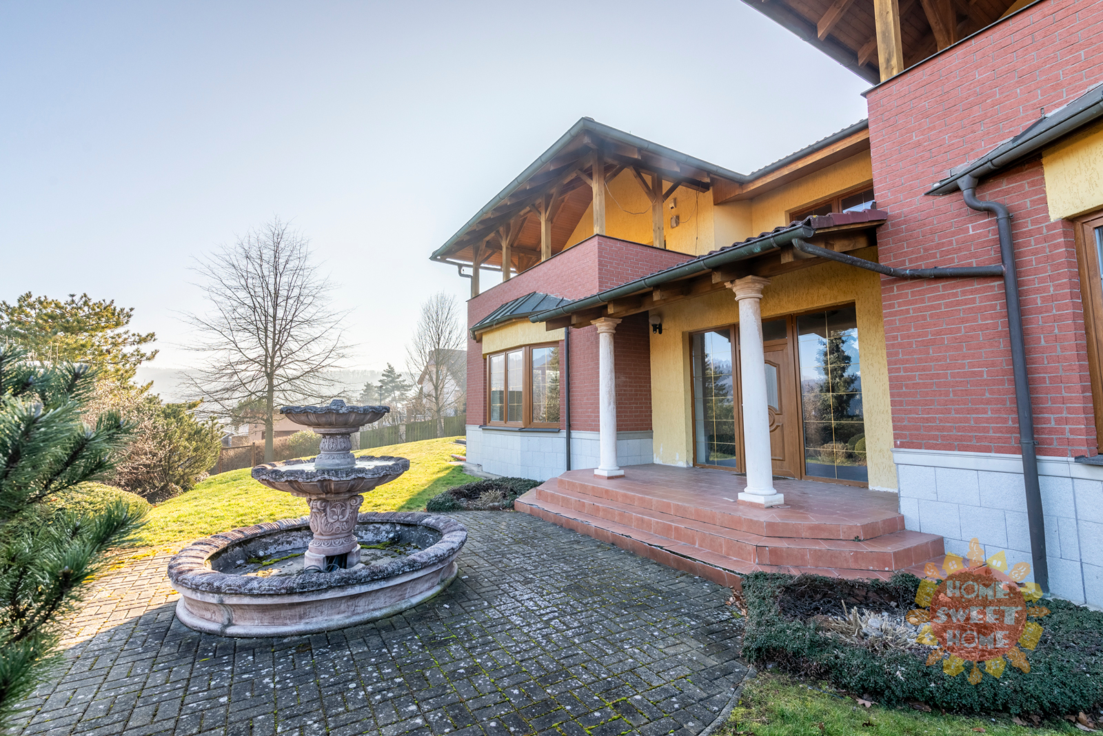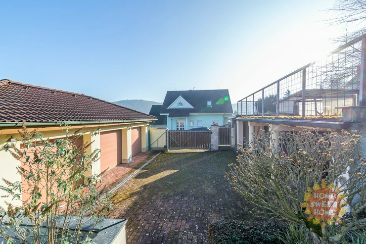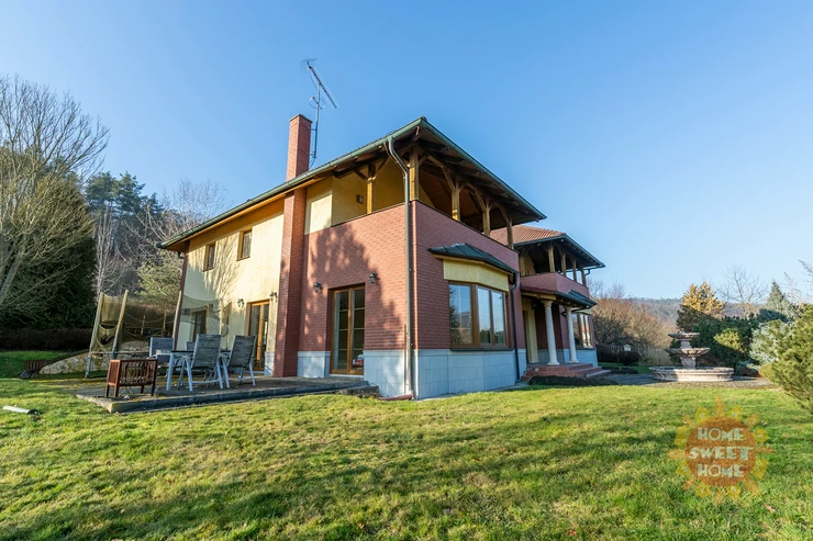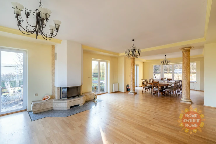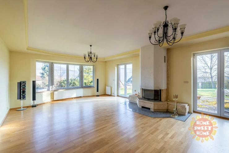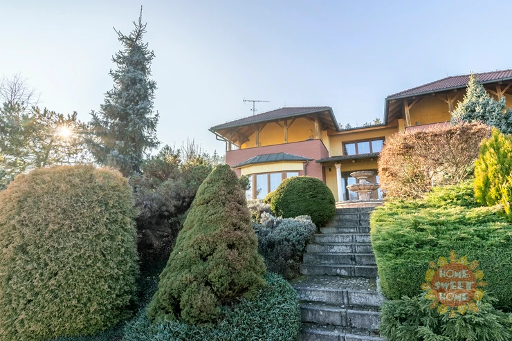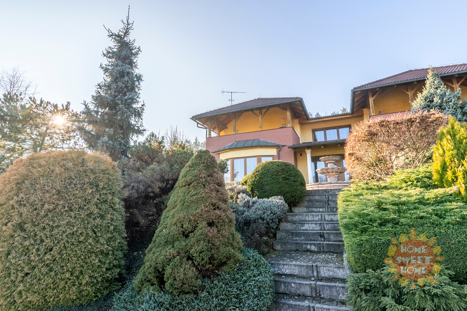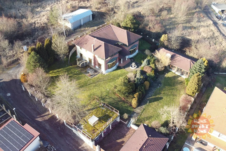 We offer for sale a villa in Třebenice, Prague-Západ district, which is characterized by a family and peaceful atmosphere, but close to the big city. The villa is located on a separate plot with an area of 2277 m² and the layout is a generously designed 7+1 with a usable area of 317.20 m² + 2 terraces. It includes a free-standing gym with a usable area of 80 m². In addition, a garage for 3 cars with an area of 74.70 m² and 3 covered parking spaces with an area of 56.80 m², so visitors can always park without problems. The house has two floors above ground and no basement.