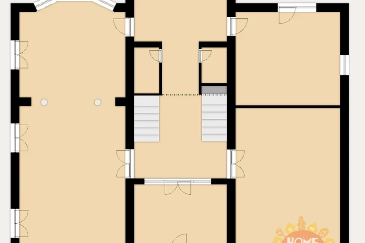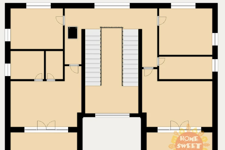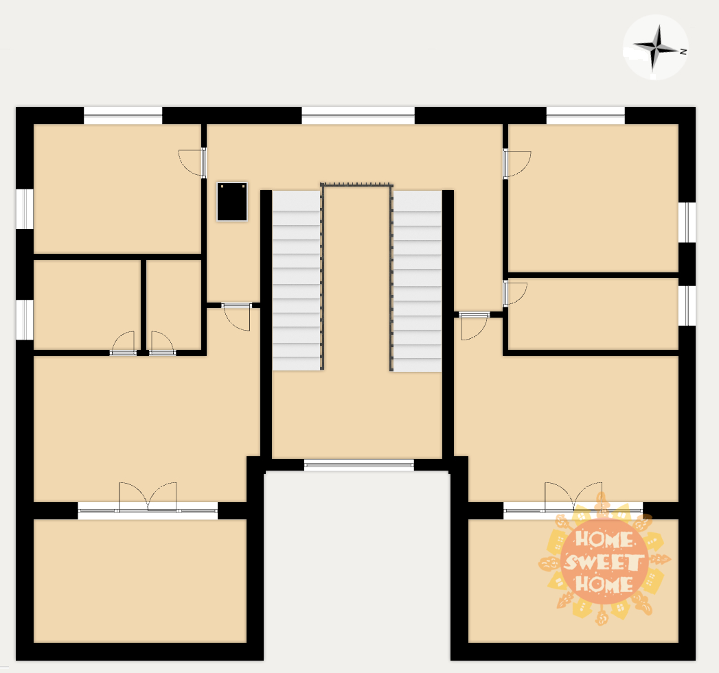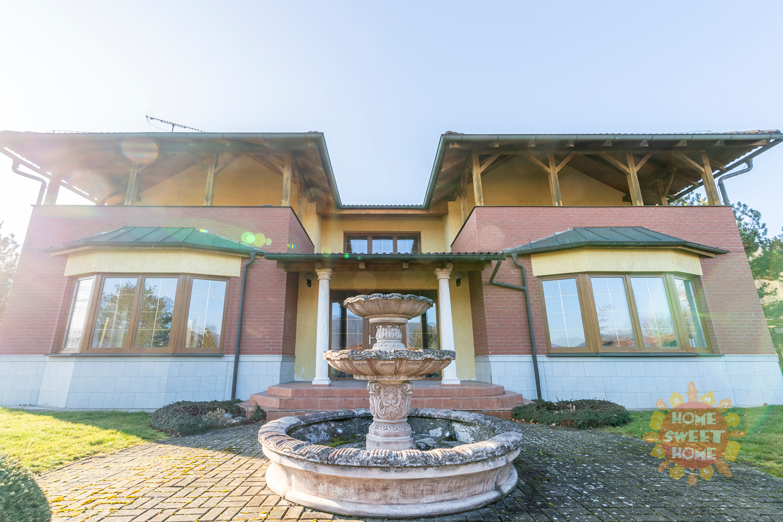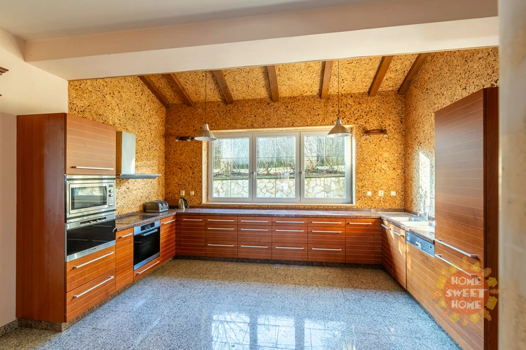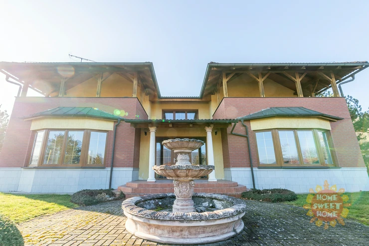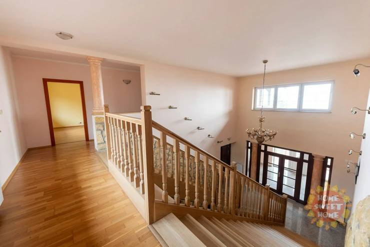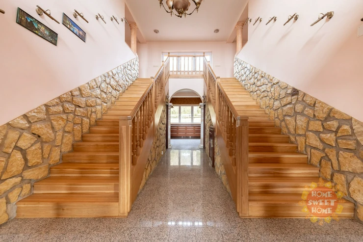 Upon entering the building, you will be greeted by a spacious hall with an impressive staircase. Ideal for welcoming guests and making a first impression. Natural stone cladding on the walls creates a rustic and warm atmosphere, while wooden railings and stairs add natural charm and a luxurious feel to the space. A double staircase complete with stylish lighting is connected by a gallery from which access to both wings of the building is possible. The space is well lit by natural light that penetrates through large double-glazed windows. To the left is the living room with dining room. On the right is the entrance to the library from the hall. At the end of the hall is the kitchen. Next to the kitchen is the entrance to the utility room, where all the technical facilities of the house are concentrated (i.e. boiler (electric), laundry room, switchboards, etc.). There is a toilet and pantry under the stairs.